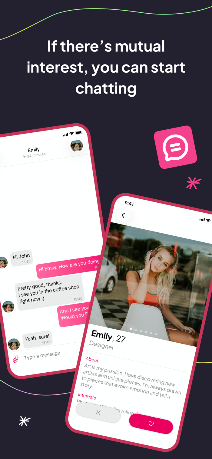 Privacy comes first. You can only chat if both of you like each other. No unsolicited messages.
