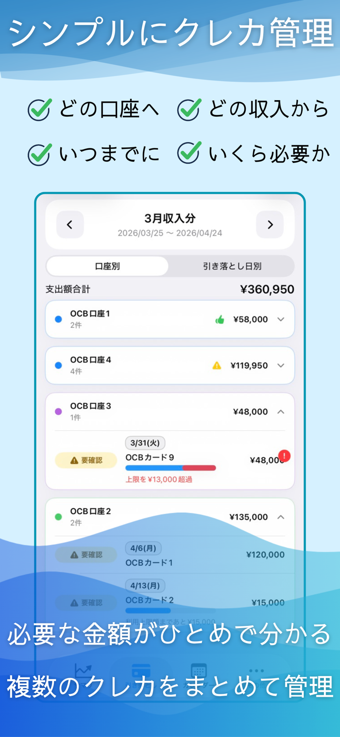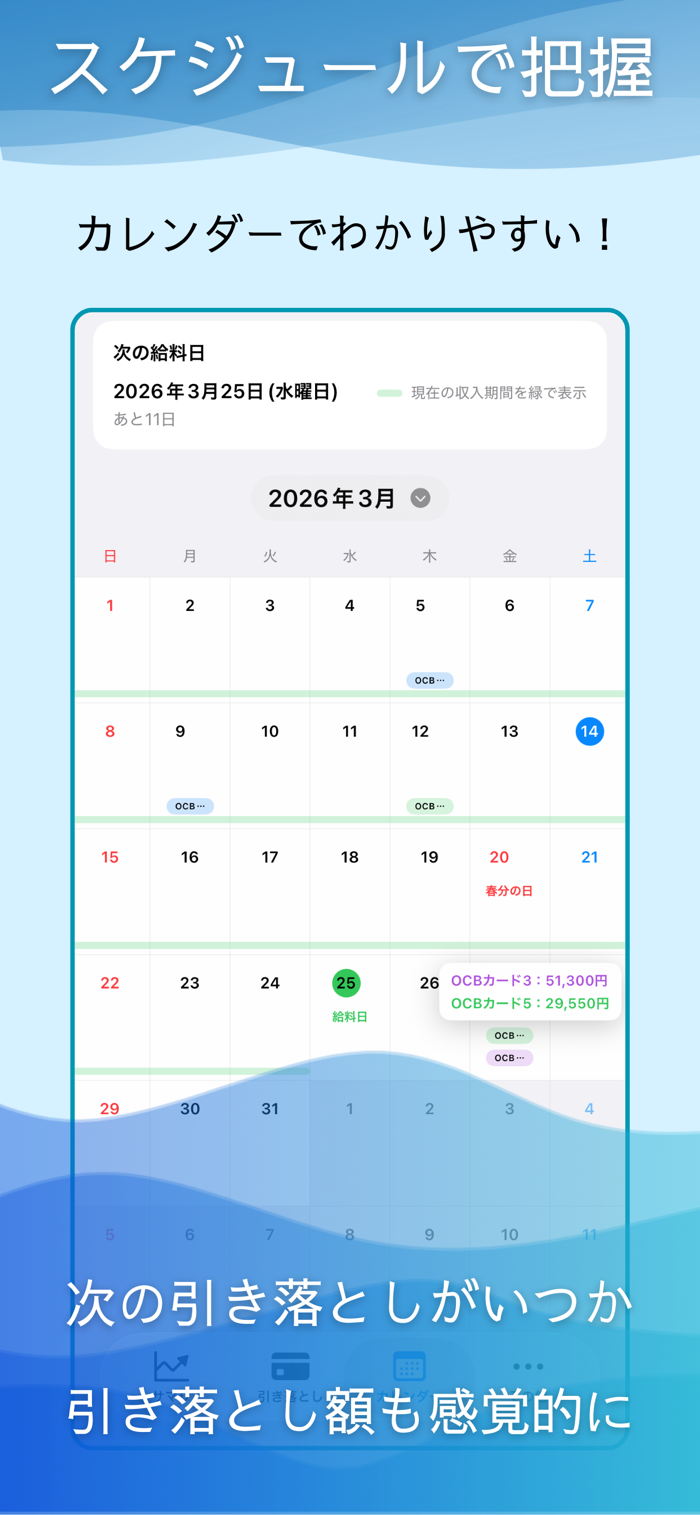 口座・カードごとの引き落とし予定を簡単に登録できます。支払い対象や金額がひと目で確認可能。