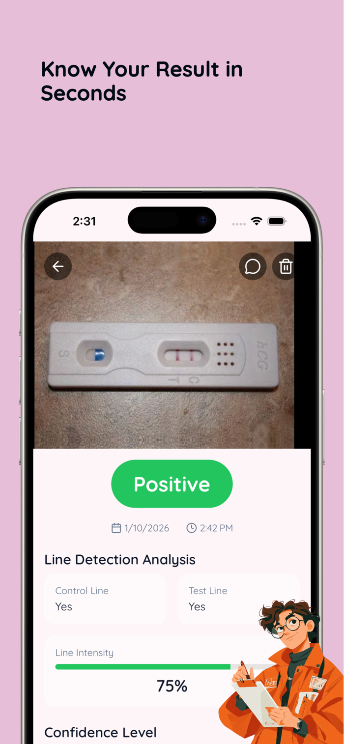 Scan and review pregnancy test images using AI-assisted line detection. Designed to help you visually interpret test results and organize pregnancy-related records.
