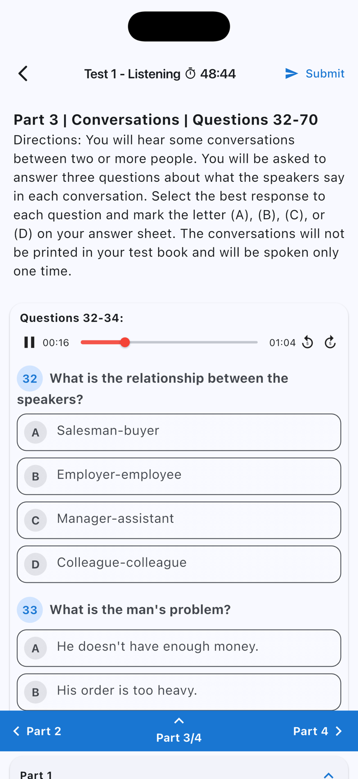 Sharpen your TOEIC skills with 50 full-length practice tests built exactly like the official exam. Monitor your progress, review detailed answers, and prepare to reach your dream score with confidence.