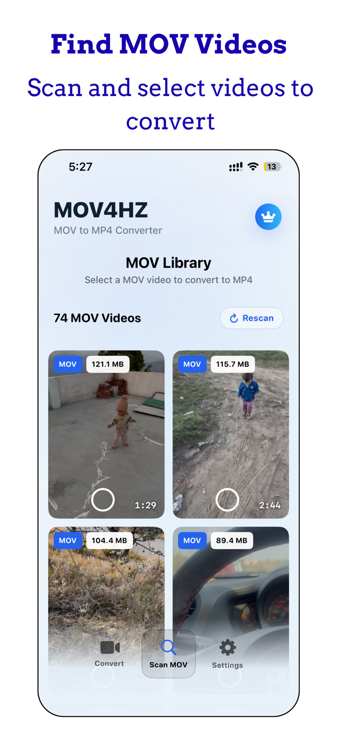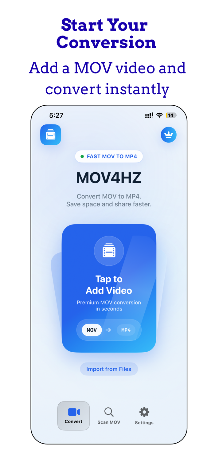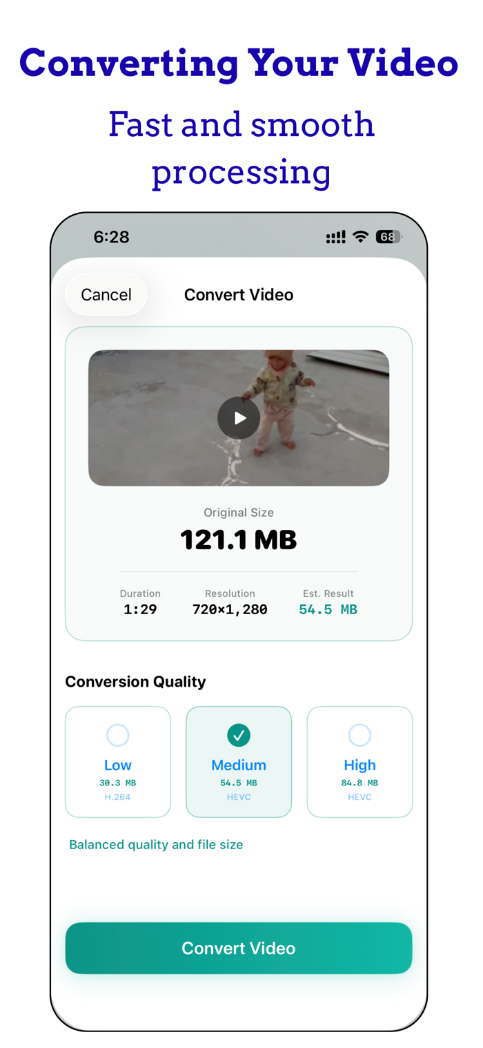 Convert any MOV video to MP4 on device, scan your photo library for MOV files, import from Photos or Files, choose Low, Medium, or High quality, preview both the original and converted video, and see the full size comparison after every conversion.