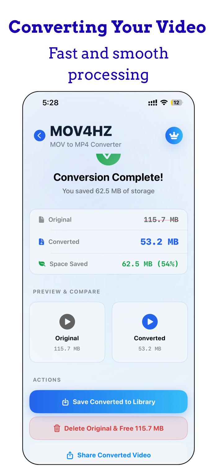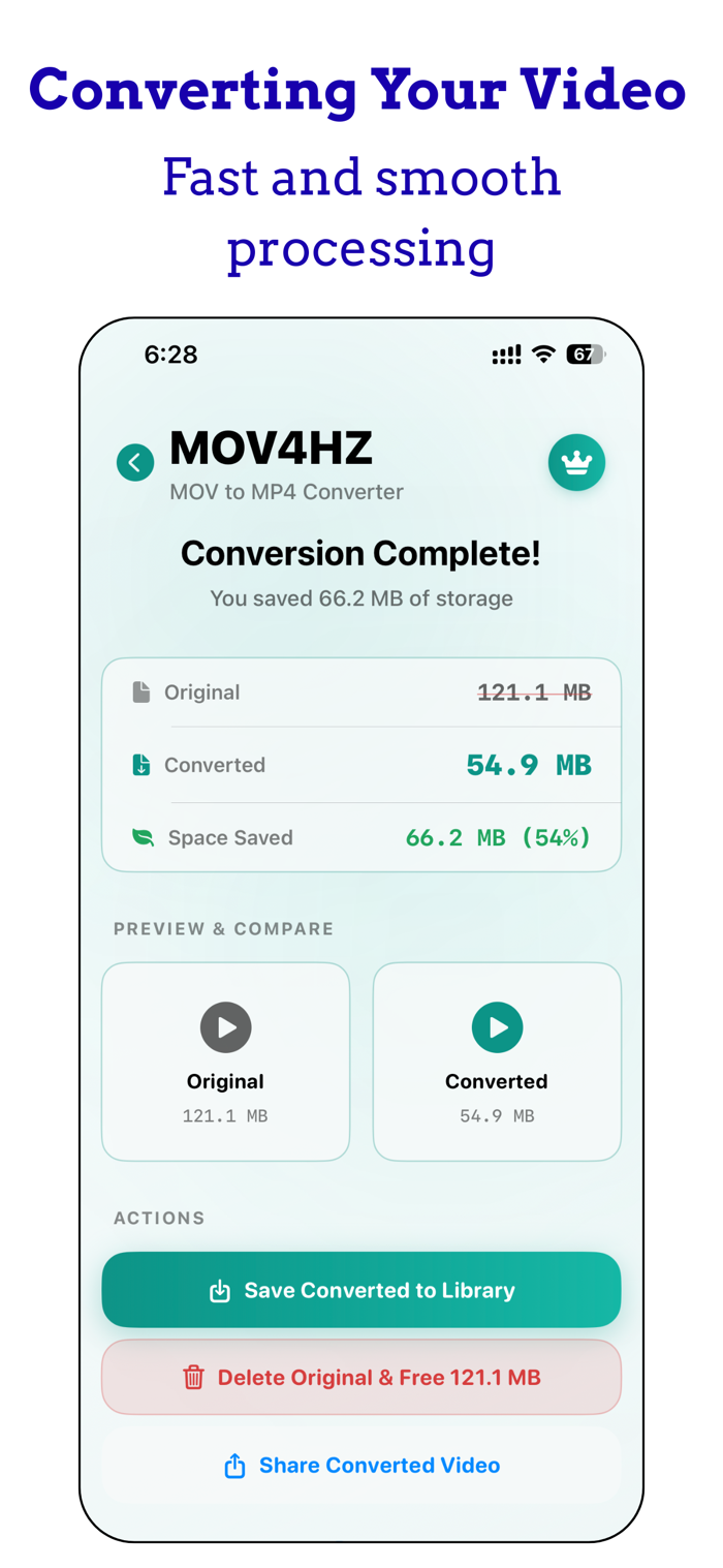 Once you have reviewed the result and are happy with it, Pro unlocks saving the converted MP4 to your library, sharing it to any app, and deleting the original MOV to free up space immediately.