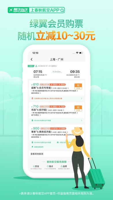春秋航空APP为您提供全面丰富的购票服务,包括:机票预订、酒店预订、航班动态查询、购买增值服务、在线值机、在线选座、机票验真、航班退改、机场助手、预约打车等;春秋航空APP购票更低价、预订更便捷!