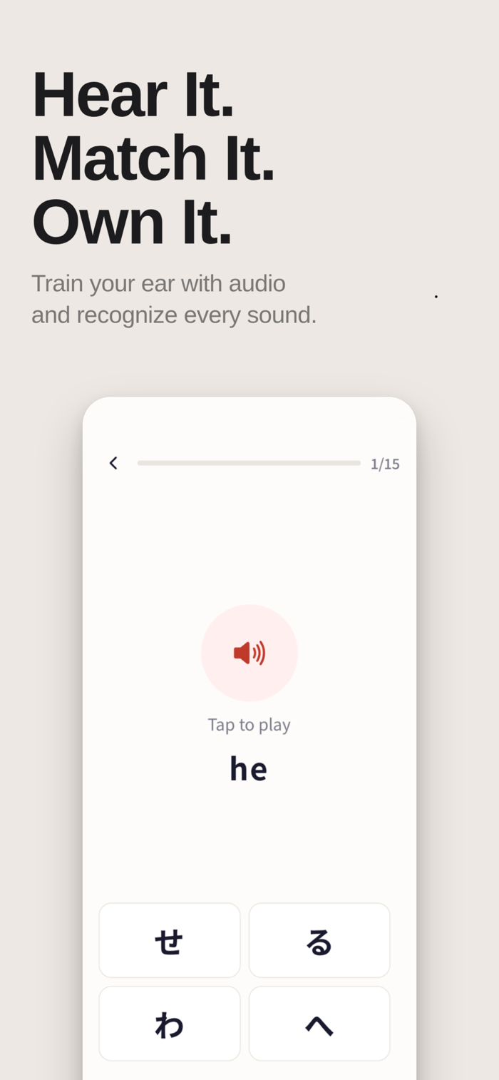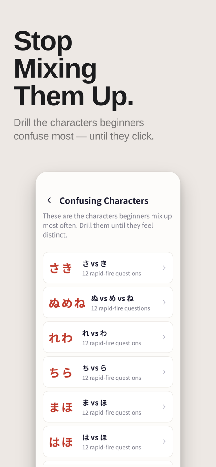 This app helps you recognize, write, and pronounce every hiragana character with clear guided practice.