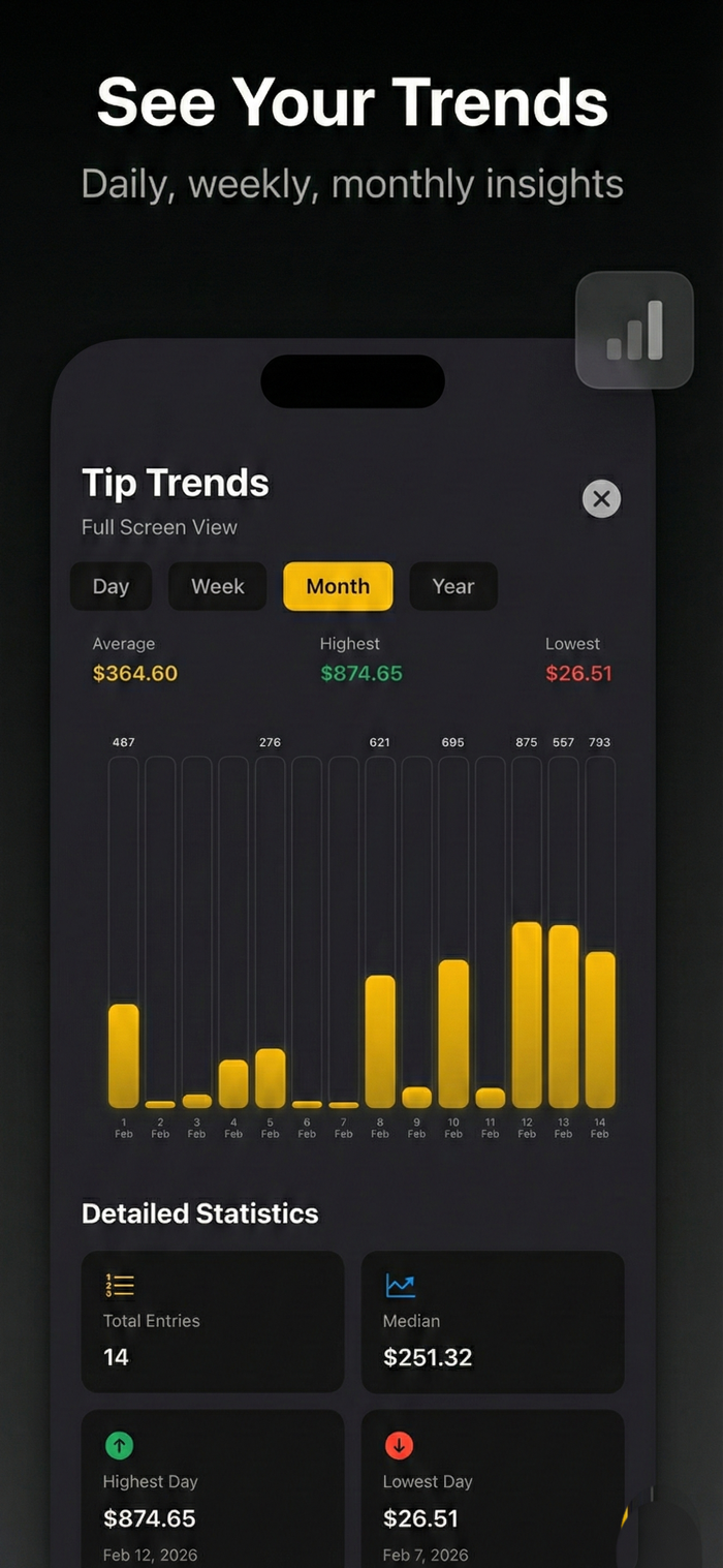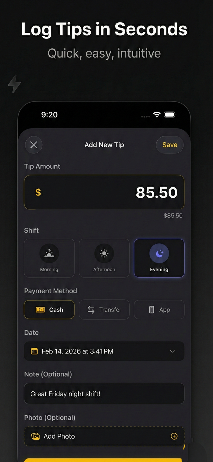 TipPocket是追踪小费和管理收入的便捷方式,适用于服务员、酒保、送货司机等所有有小费收入者。其核心功能包括:快速小费记录,能秒速添加,按班次、支付方式记录,可附照片和笔记;智能洞察与图表,展示小费趋势,提供多时段统计;月度目标设定,可设目标及查看进度;还能导出数据。