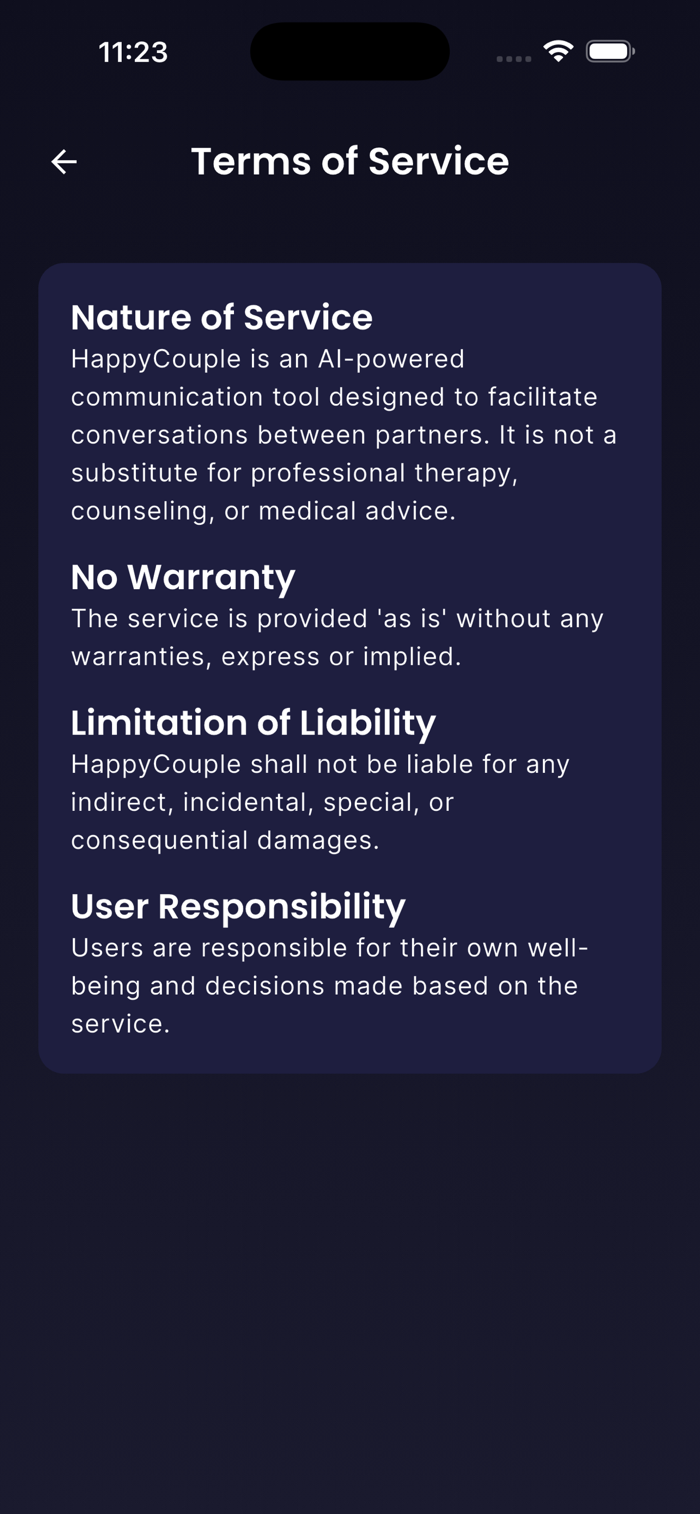 Please note: Happy Couple AI is designed to facilitate communication and provide conversational guidance. It is not intended to, and does not constitute, professional medical, psychological, or mental health advice, diagnosis, or treatment. For serious relationship concerns, please consult with a qualified professional.