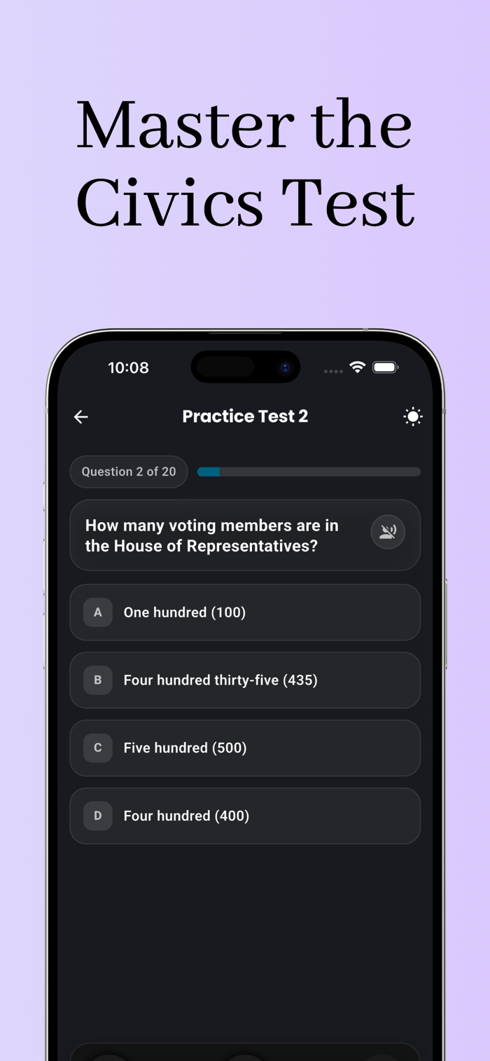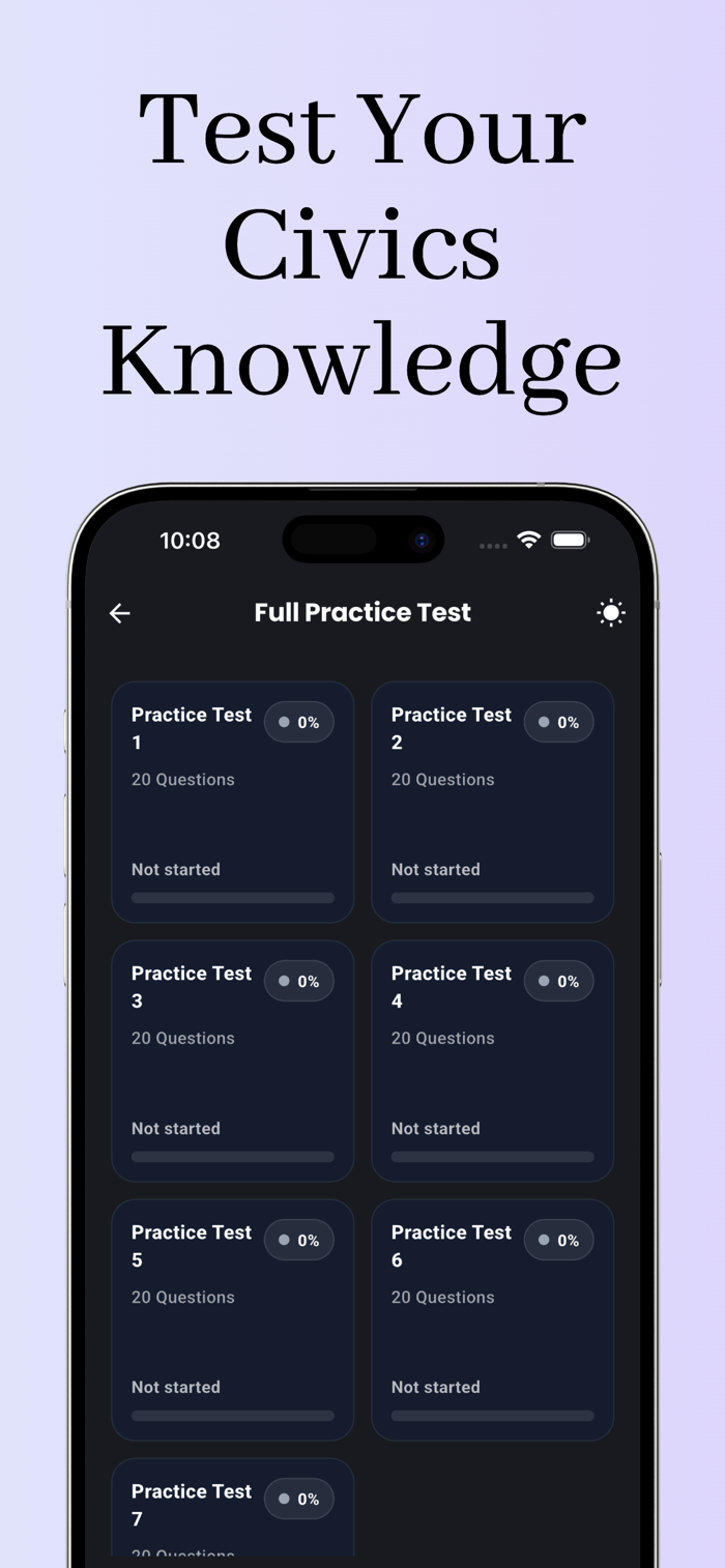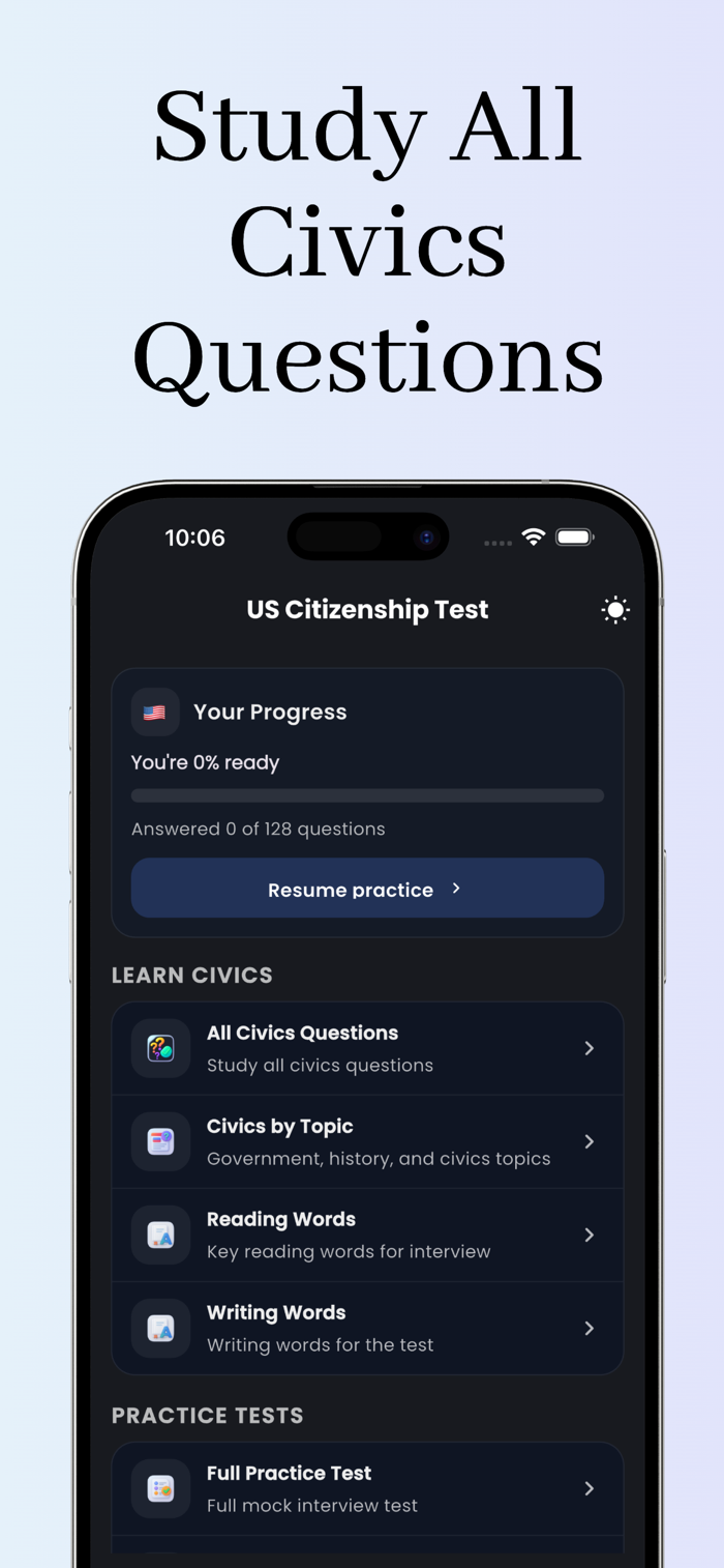 This app helps you learn and practice all 128 civics questions used in the naturalization test. Study with flashcards, quizzes, and realistic practice exams designed to help you feel confident on test day.