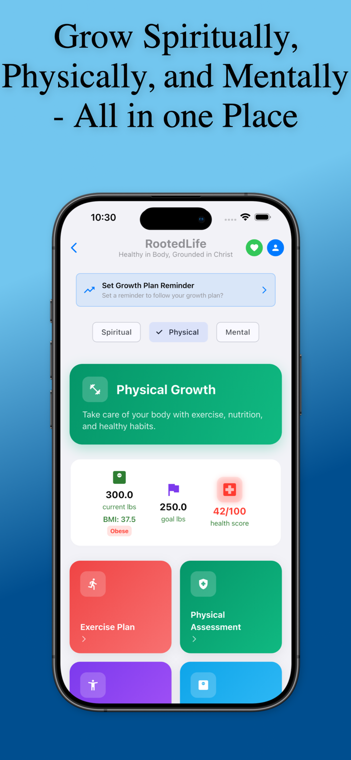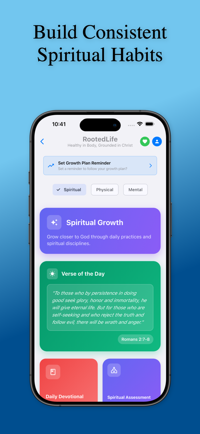 RootedLife combines faith and wellness in a simple, uplifting experience. Track your progress, stay encouraged, and live more intentionally every day.