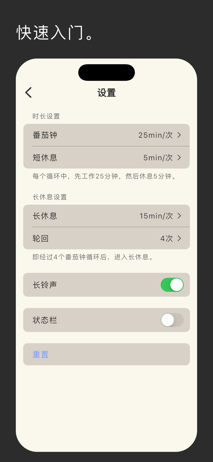 - 低饱和度设计,保护你的眼睛。- 仿真闹铃与钟表,风格简约。- 内置番茄钟与正计时功能。