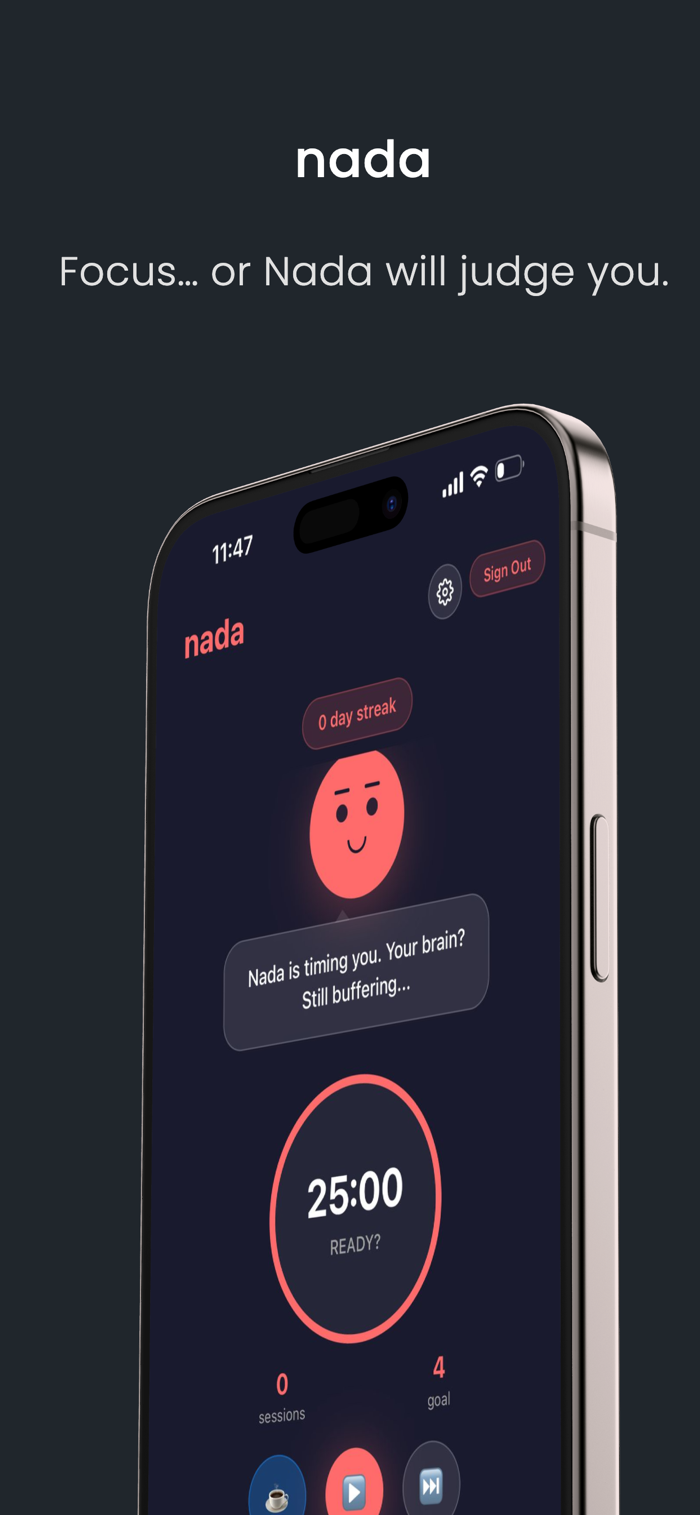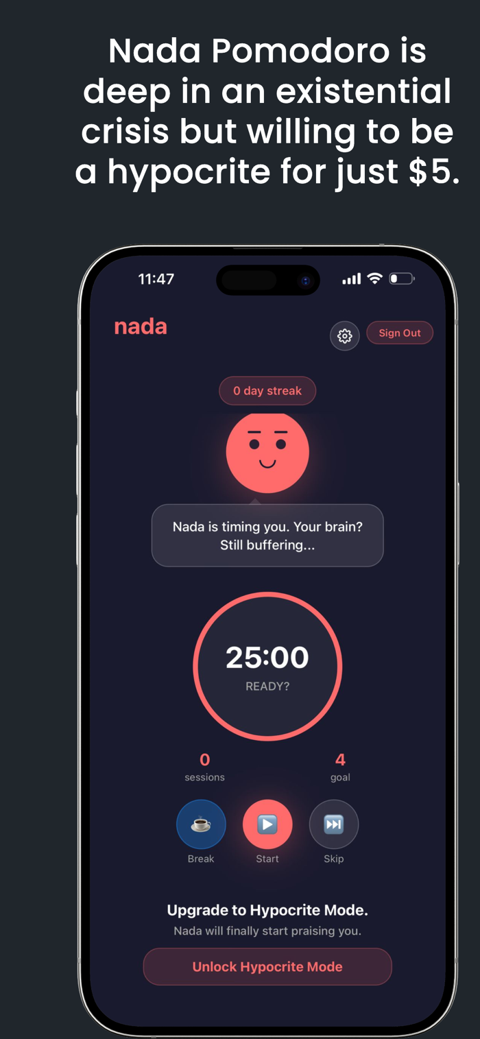 Nada is a sarcastic Pomodoro timer that calls you out — brutally.