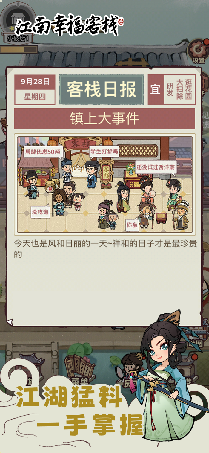 你将化身心怀热忱的江湖新手掌柜 —— 虽身在江湖,志却在灶台与客堂之间。接手一间破败小栈,怀揣着将其发扬光大的初心,在老掌柜的悉心提点与伙计们的同心协力下,精心打理、用心经营,一步步将冷清破落的小店,打造成名震江湖、人人向往的 “天下第一客栈”!