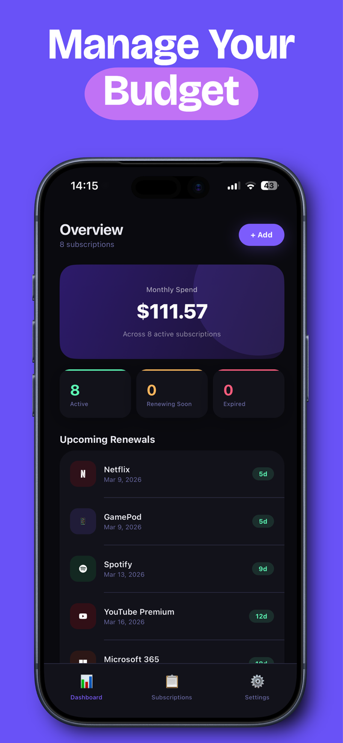 SubTrack帮你掌控 recurring expenses,了解每月资金流向。它能在一个有条理的仪表盘里管理所有订阅,涵盖多种服务。管理订阅轻松简单,可便捷添加、编辑和监控 recurring payments, renewal dates前会有通知,避免意外收费和忘记试用。能提前设置提醒,让你及时决定是否保留或取消服务,不再错过renewal。