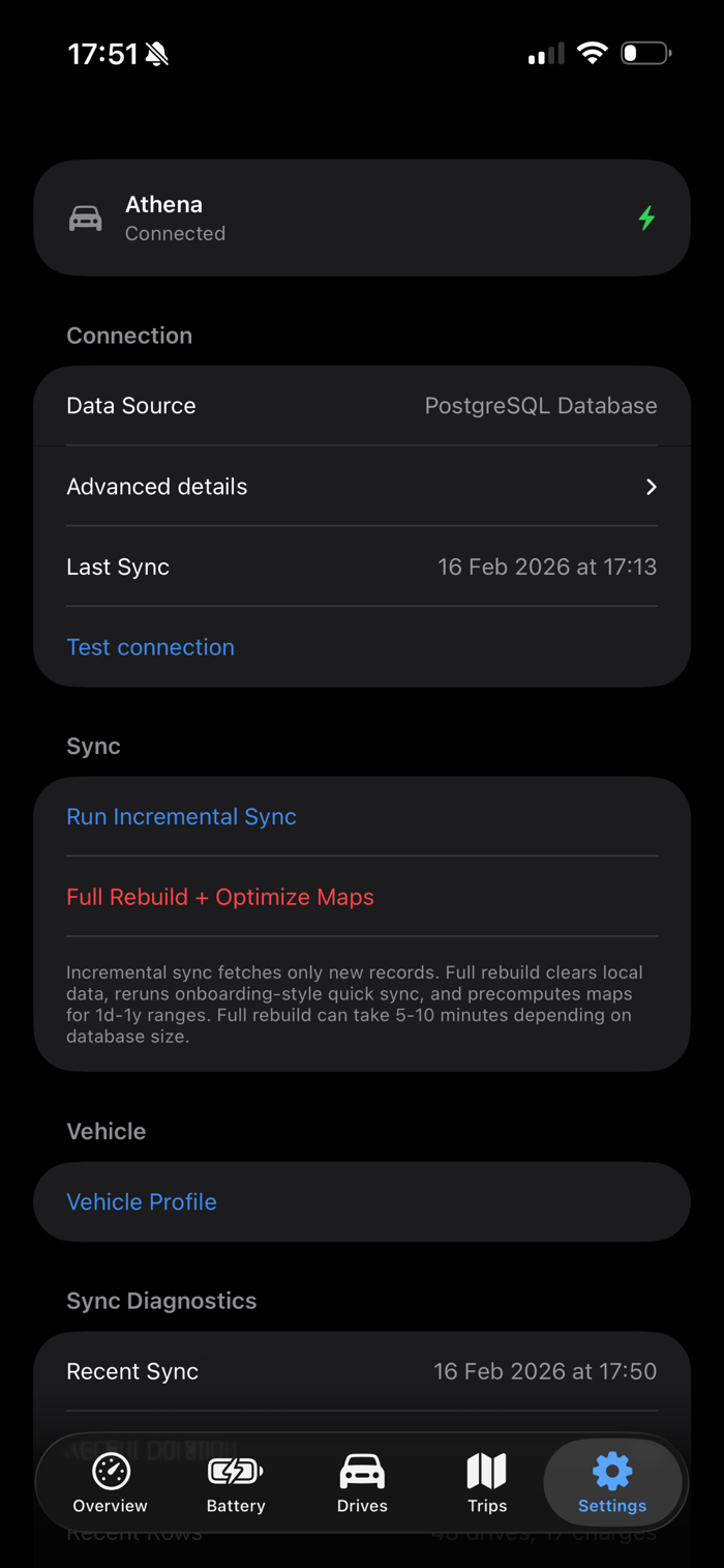 Connect directly to your TeslaMate PostgreSQL database on your local network, sync your data to local storage, and explore your