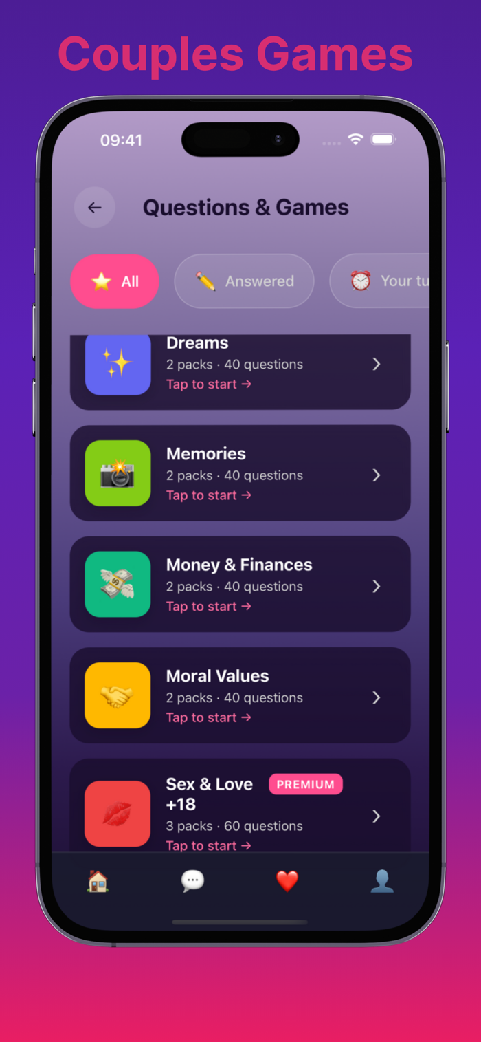 THEMED QUESTION PACKS - FROM DEEP TO SPICY Keep the discovery going with our library of themed question packs. Whether you're a new couple or have been together for years, you'll find the perfect set of couples questions. Explore topics like Future Goals, Date Night Fun for cozy couples, and even spicy questions to turn up the heat and connect with my love.