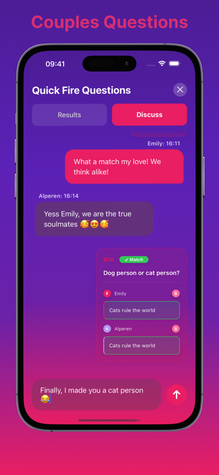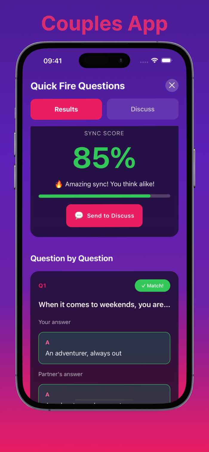 THE SYNC QUIZ - FUN COUPLES QUESTIONS Discover how well you truly know your partner with our signature couples games! Answer questions about yourself and guess your partner's answers. Our vast library of couples questions sparks hilarious conversations and surprising revelations. It's the perfect way to connect, perfect for cozy couples looking for a fun night in. This feature is a gateway to daily couple joy.