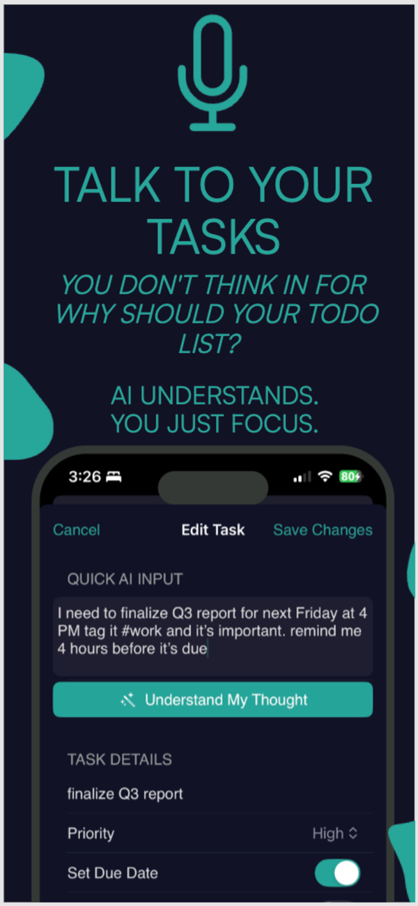 Clary is designed for "zero-thinking" capture. You don't fill out forms. You don't manually set dates. You simple speak, type, or snap, and Clary's completely overhauled AI engine understands exactly what you mean, where it goes, and when you should do it. It just works.