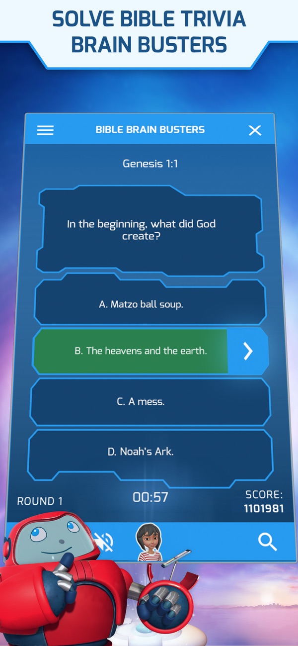 • Choose the right answer in an engaging Bible trivia game – important questions for kids with fun Biblical answers.