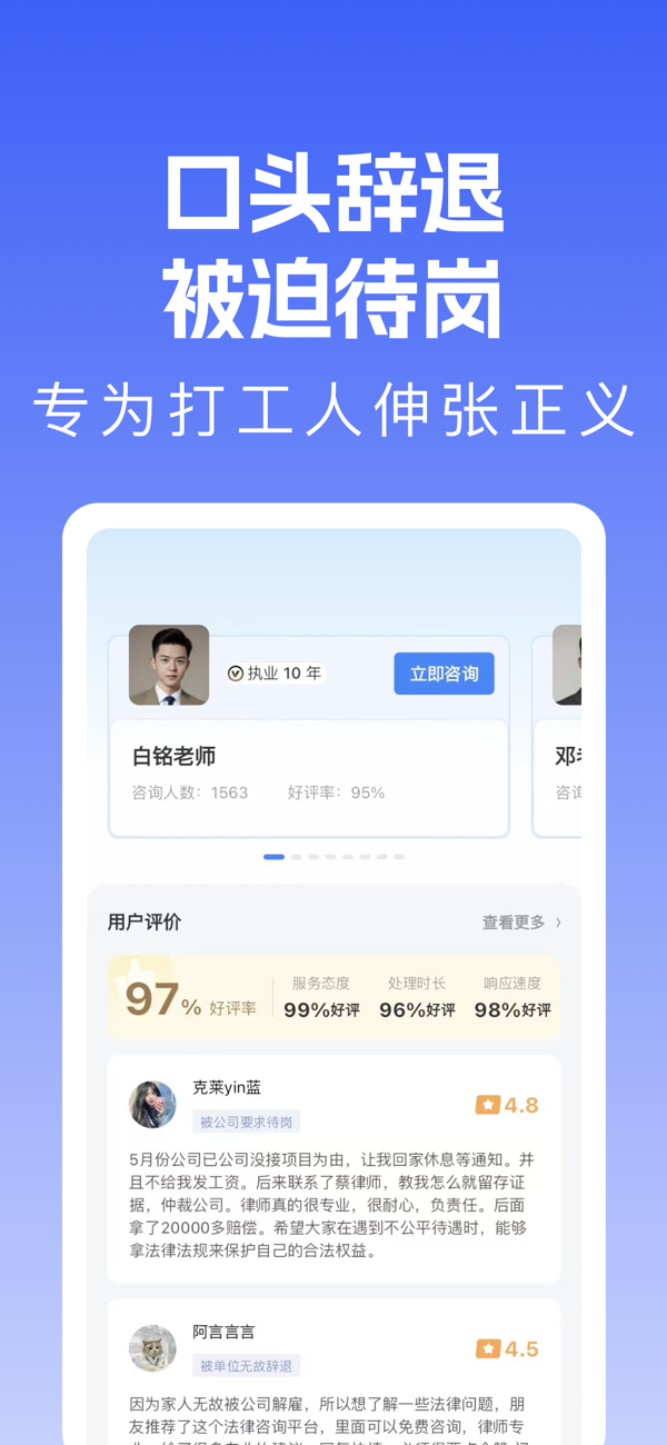 专业劳动法咨询APP,专注处理全国劳动纠纷,维护劳动者权益。提供24小时在线律师咨询,高效解决问题。针对无故被辞退、调岗降薪等劳动纠纷,涵盖劳动仲裁、违法辞退等多方面,能提供精准高效的法律维权方案,致力于为用户提供专业、全面的法律服务,助其维权获赔偿。