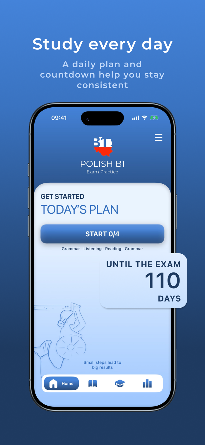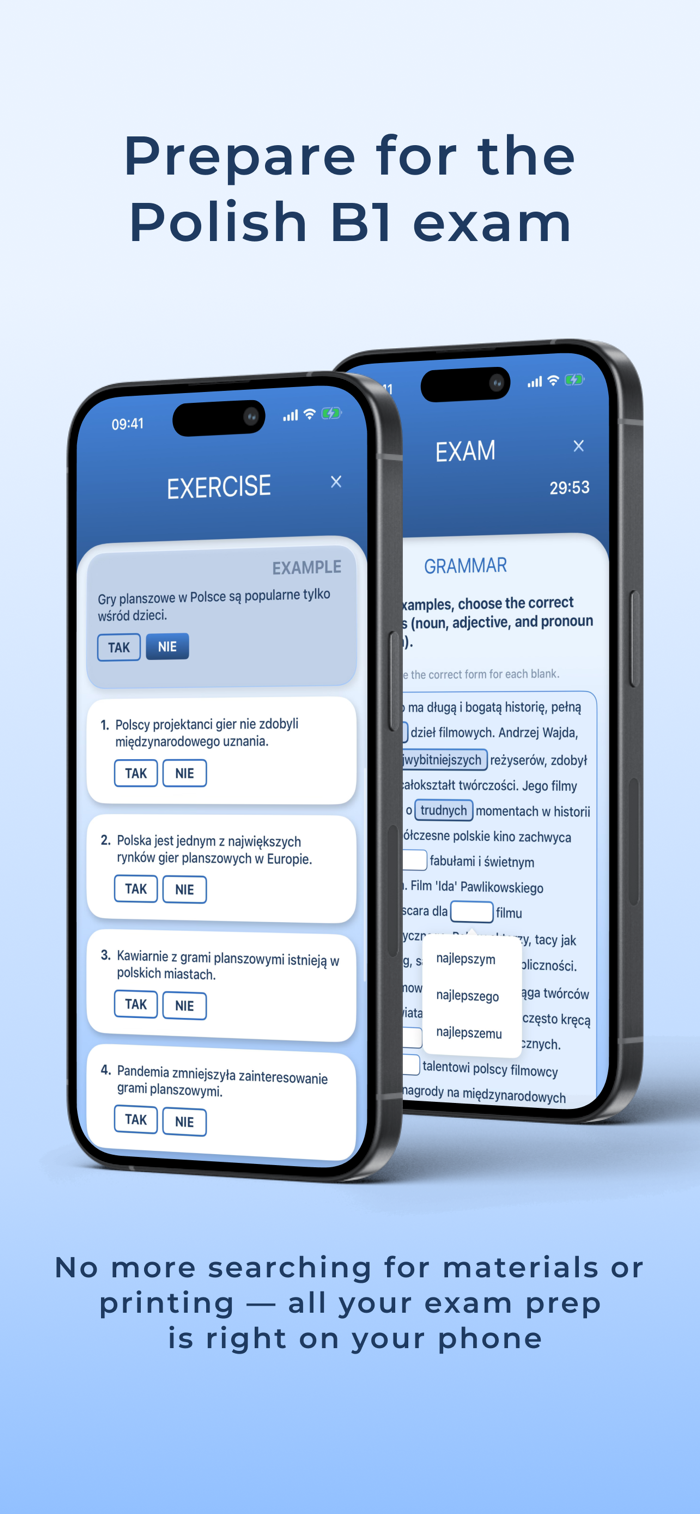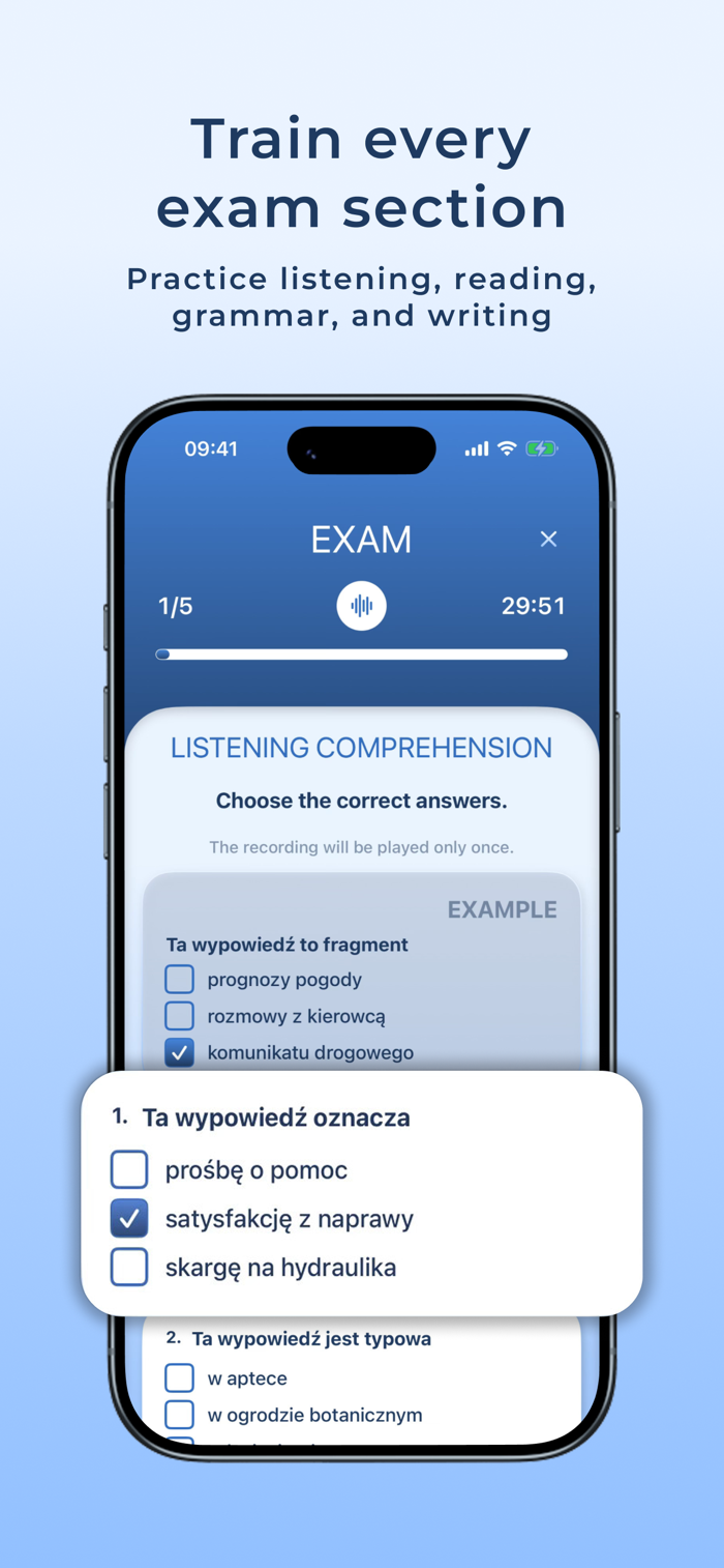 Prepare for the Polish B1 exam with realistic practice, full exam simulations, and clear progress tracking in one app.