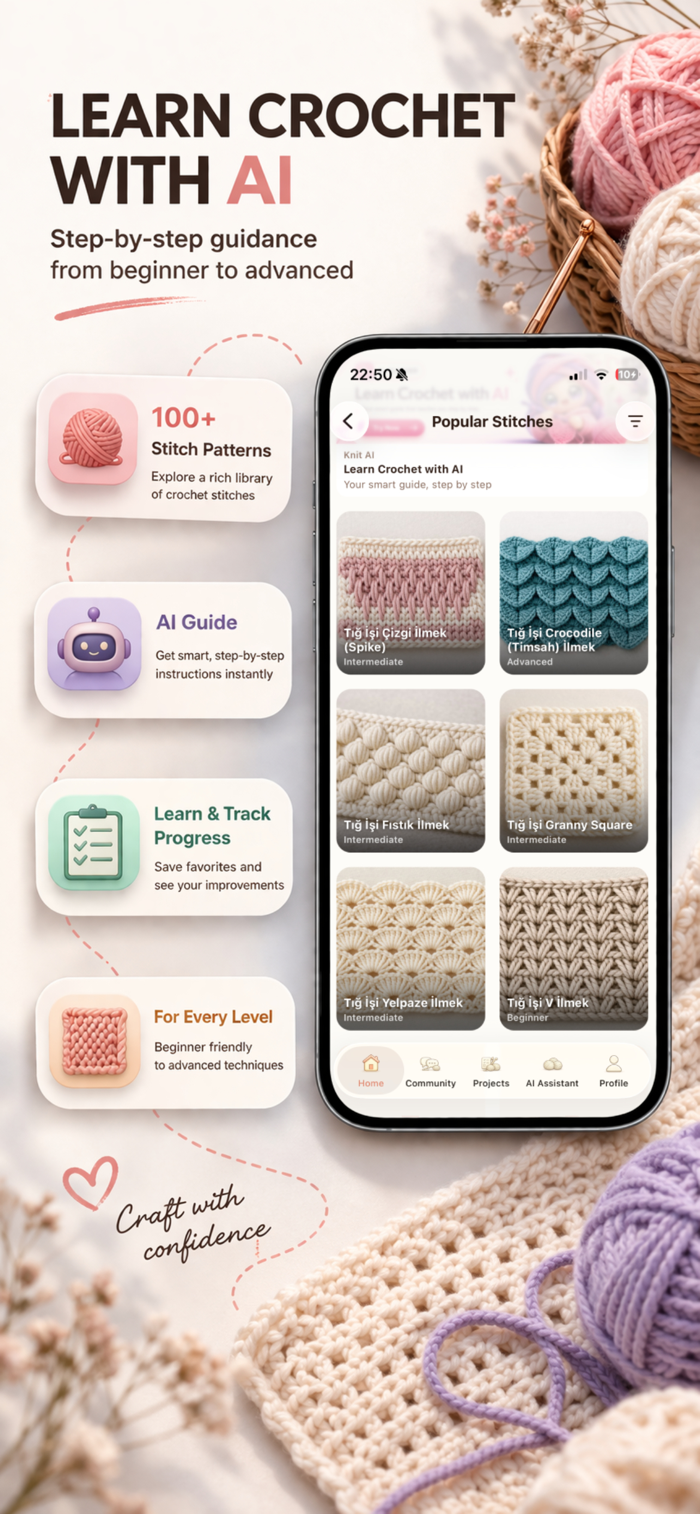 Whether you're tracking rows, learning new stitches, creating patterns or organising your yarn stash, Knit AI helps you stay focused and creative.