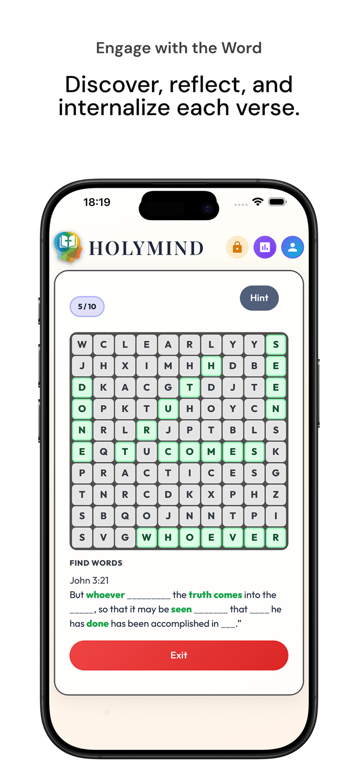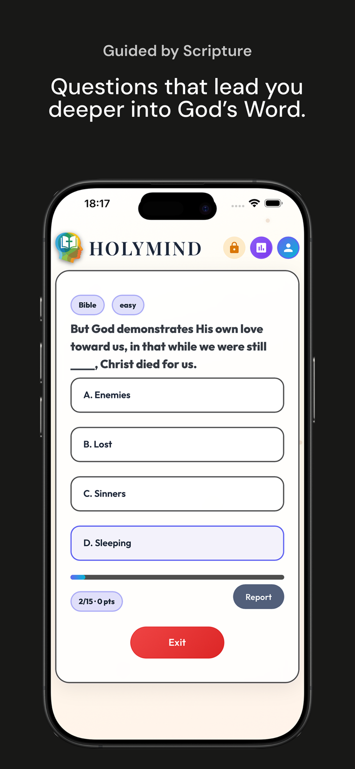 Whether you want to test your knowledge, stay consistent, or spend a few meaningful minutes with Scripture each day, Holymind gives you a simple and engaging way to study the Bible.