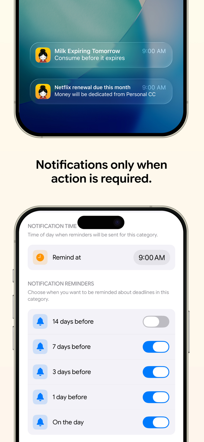Get notified before things expire not after. Set custom reminder schedules for each category: