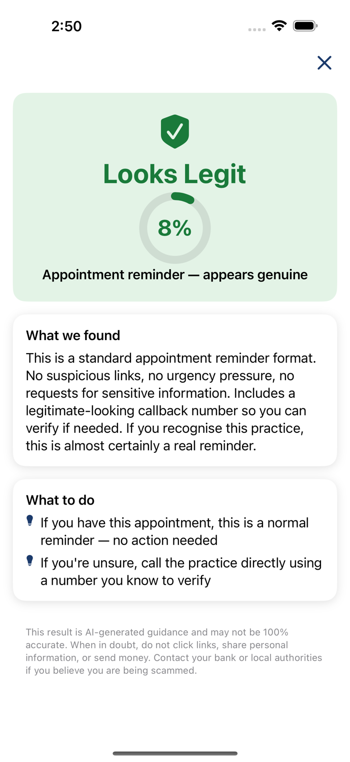 Worried that message might be a scam? Snap a screenshot, take a photo, paste the text, or just describe what happened — Nyzra uses advanced AI to tell you in seconds. No tech knowledge needed. No accounts. No jargon. Just a clear answer: Scam, Suspicious, or Legit.