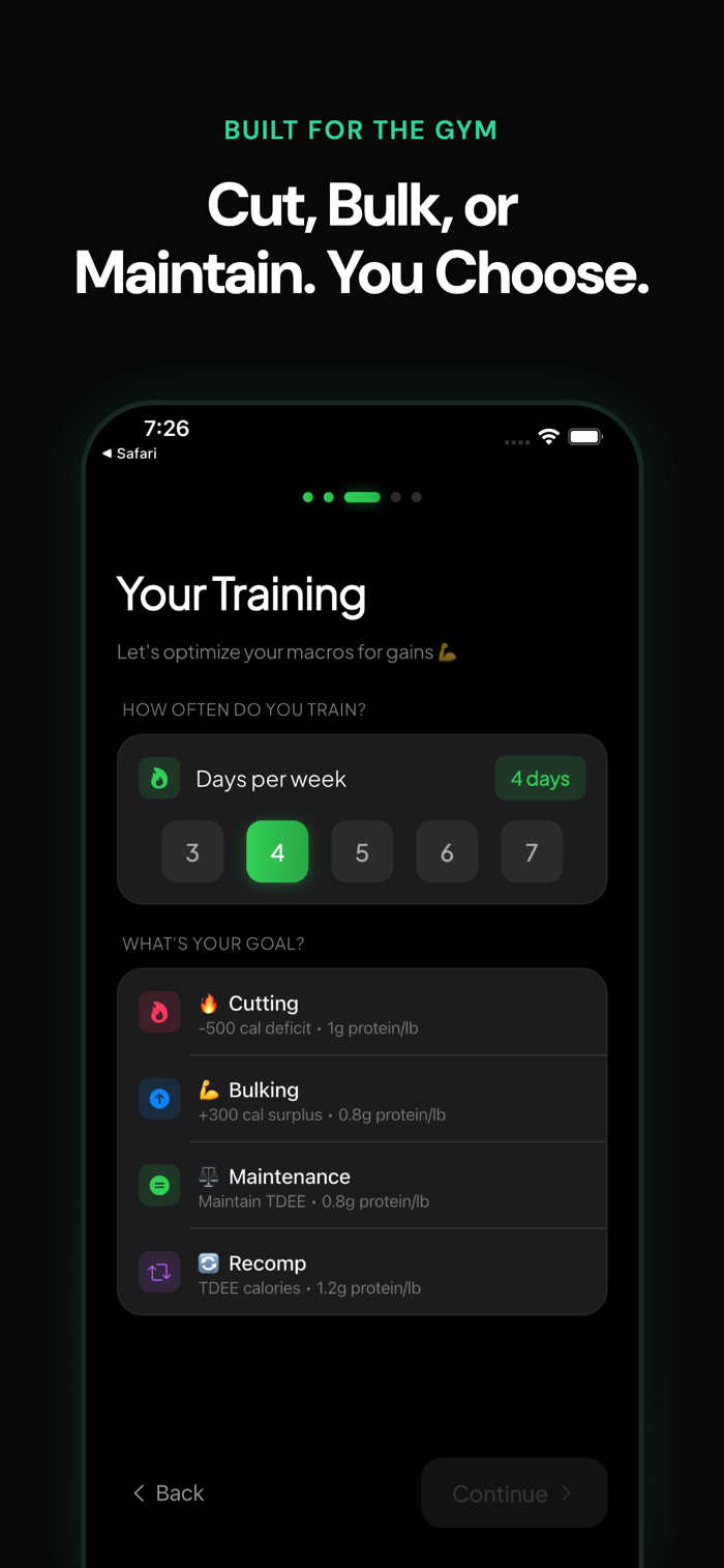 Auto-adjust calories on workout days. +300 cal when you train, maintenance on rest days.