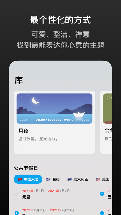X Progress 中包含多个由不同设计师精心设计的主题可供选择。无论是可爱、整洁或是禅意风格,你都能找到最能表达你心意的主题来展示事件进度。