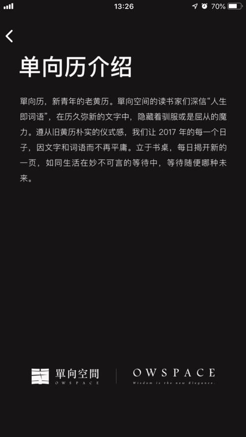 单向历 APP 配合单向历 2018-2019 桌历使用。下载具有增强现实技术( AR)的APP后,扫描桌历的特定页面,会有单向空间邀请的作家、诗人、音乐人为你朗读和阐释当日单向历推荐的精彩词句。这些思想者,等待被你倾听。