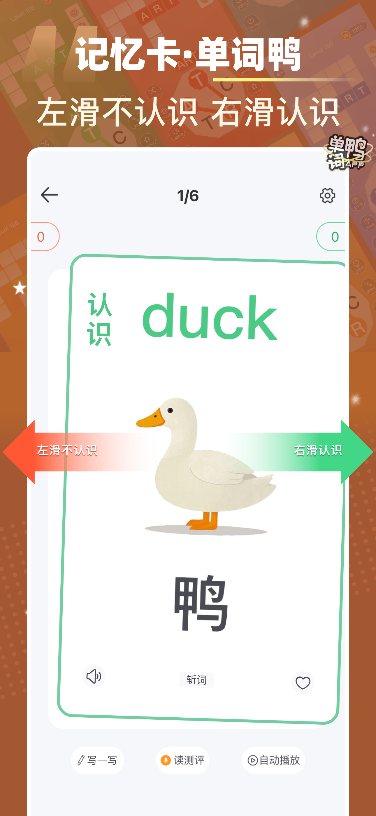 单词鸭是一款用消消乐方式学单词的软件.可自建词库,生成单词消消乐&记忆卡.用相机对着任意物品轻轻一拍,自动识别物品&给出物品单词音标释义,生成该物品的单词卡,收集周边物品的单词卡.像玩消消乐一样的消单词,像玩数独似的拼单词!摆脱传统枯燥无兴趣背单词,在玩中不知不觉学会单词,玩多久都没有浪费时间的罪恶感.关卡的生成算法基于艾宾浩斯遗忘曲线,千人千面抗遗忘