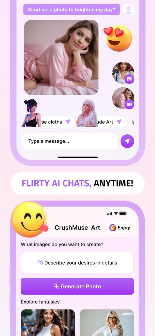The most advanced romance chat you've ever had. Fun and flirty dating app with no strings attached. Engage in a friendly chat, roleplay, grow your love & relationship skills. CrushMuse fosters a safe environment where you can explore digital intimacy through engaging conversations with AI girlfriend and personal visual content. Your dream companion awaits.