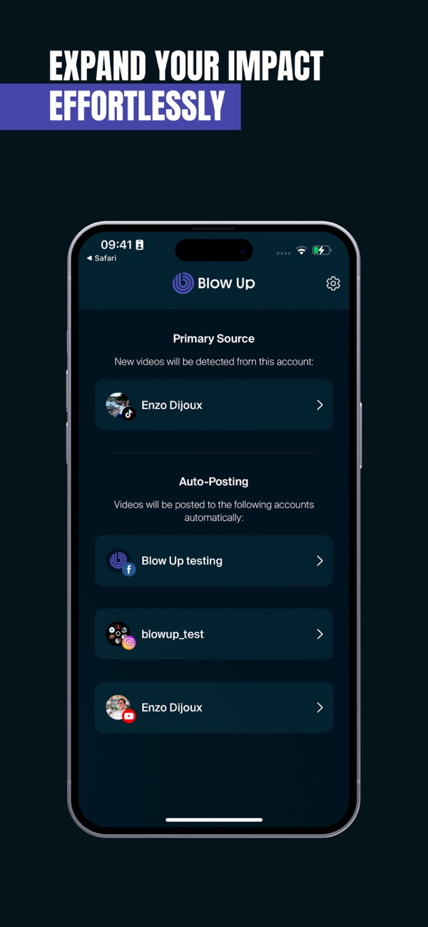 Blow Up is the ultimate tool for creators and professionals who want to save time and maximize their social media impact. Automatically detect and repost your videos from one platform to others like YouTube, TikTok, Instagram, and Facebook, without the hassle.