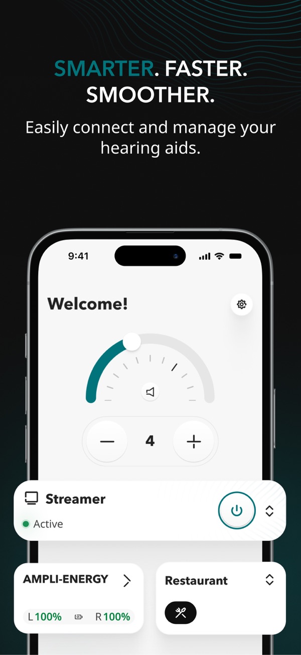 Smart Hearing Aid Management: Pair your compatible Bluetooth® hearing aids and take full control — adjust programs, volume, and background noise levels with ease.