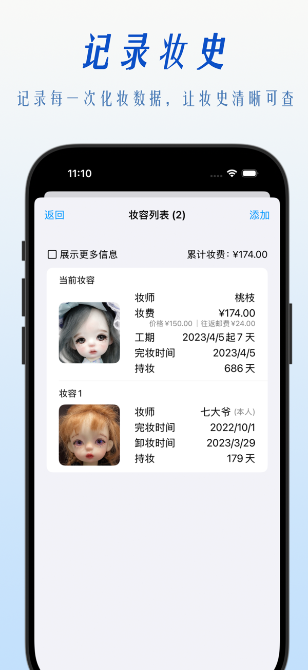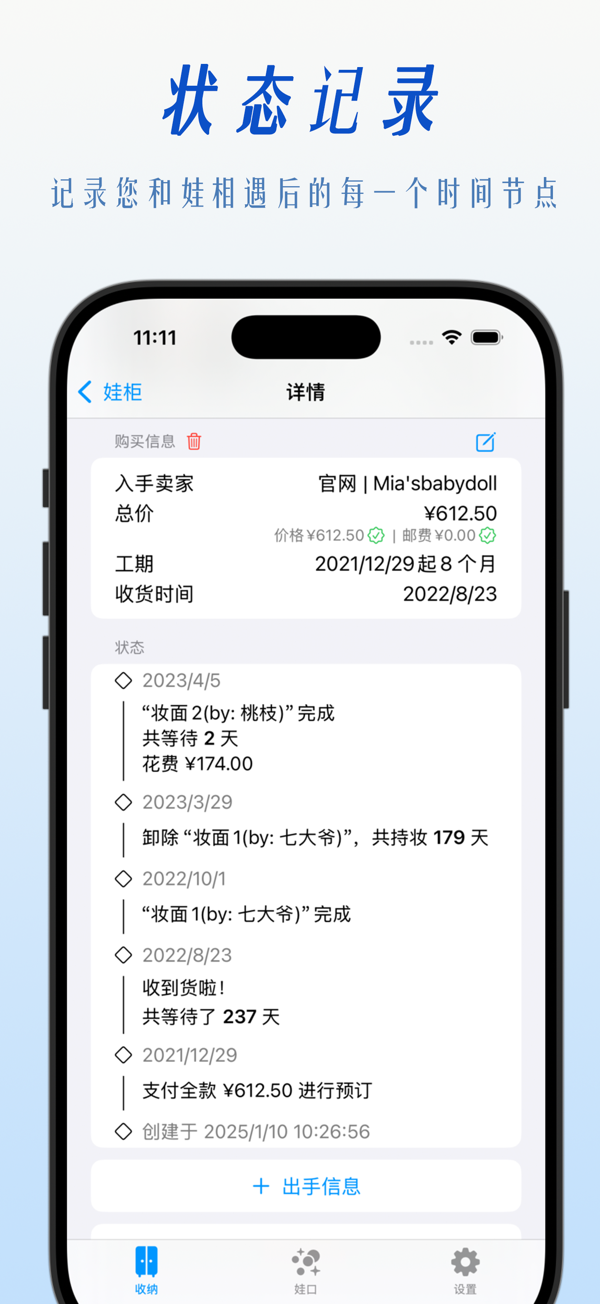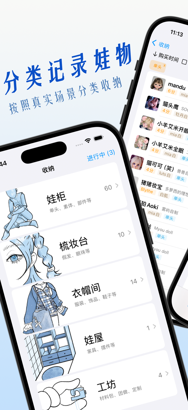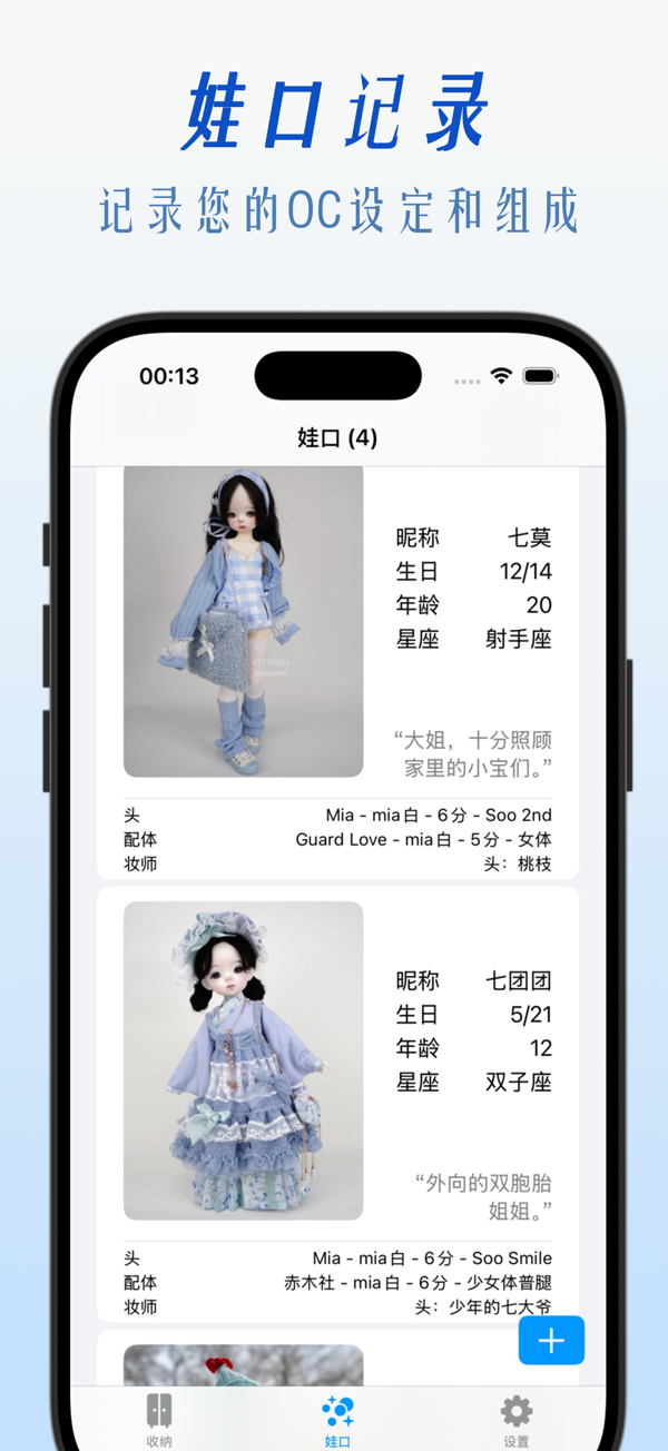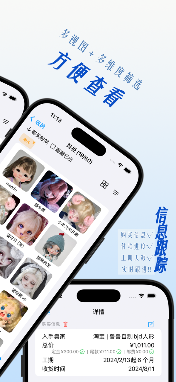 An organizing app designed specifically for doll lovers to record doll-related items' data and events. Organize them by real-life scenarios, support multiple browsing views and efficient retrieval. Add information modularly to record the status of doll items, makeup history, purchase and payment progress. Back up across devices and ensure data security. Receive timely message notifications to keep track of key time nodes. Also record information about the dolls in your collection and create a dedicated photo album for your original characters. See the link for details. Helps you enjoy the fun of playing with dolls more efficiently and in an o...