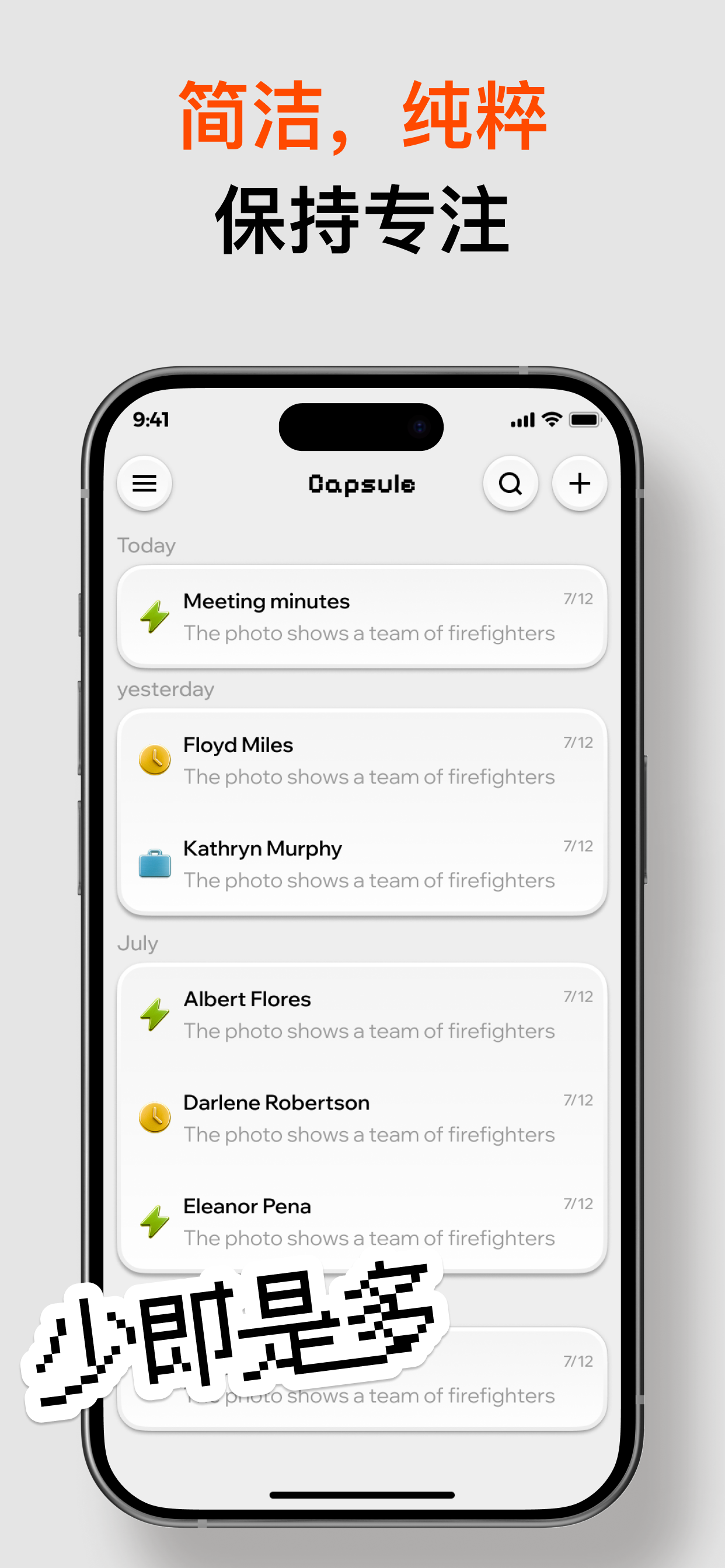 介绍Capsule Note,这是一款极简备忘录应用,专为那些希望在不引入不必要的复杂性情况下捕捉和组织笔记的用户而设计。它拥有简洁的界面和直观的分类功能,是您管理思绪、任务和工作细节的首选工具——所有这些内容都可以在同一个地方处理。分类记录笔记,一目了然将笔记分类:突发灵感的想法、待办事项、专业笔记等。不再需要费力查找杂乱无章的列表——每种类型的笔记都有其专属的空间。基于时间线的检索功能,清晰的内容笔记按"今天"、"昨天"和月度时间线组织。可以快速检索过去的条目,毫不费力地掌握信息背景。轻量级多格式捕获,零摩擦捕获——支持多种格式,包括文本、图像等。无论是鼓舞人心的照片还是简短的文字片段,都可以在几秒钟内将其保存到相应的类别中。没有陡峭的学习曲线,只需即时组织。下载胶囊笔记,用极简主义设计重塑你的笔记习惯,让有组织的日常生活变得轻松简单。