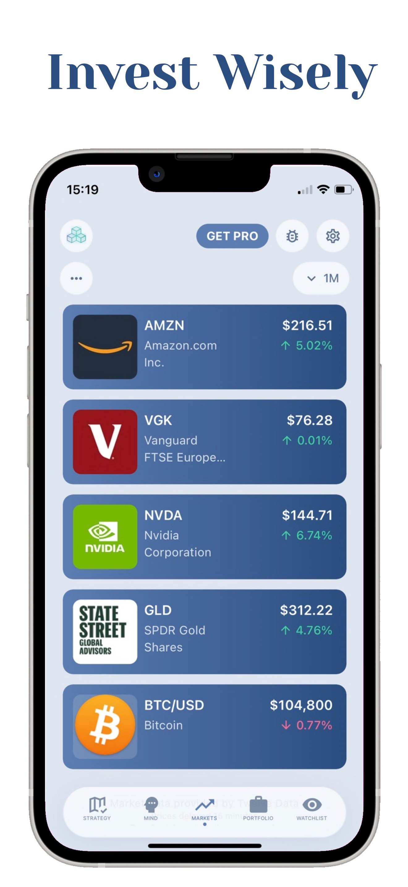 Keep Tabs on the Market • Track stocks, ETFs, cryptocurrencies and indices • View performance across customisable time periods • Organise assets into Markets, Portfolio and Watchlist views.