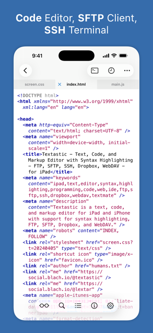 Textastic是一款功能全面且多功能的文本和代码编辑器,适用于iPad和iPhone。它支持对超过80种编程和标记语言的语法高亮显示。可以连接到SFTP、FTP和WebDAV服务器,或者连接到Dropbox账户。利用内置的SSH终端,可以直接在服务器上进行操作。功能包括: