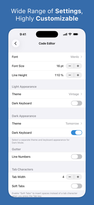 · WebDAV服务器,便于通过Wi-Fi从你的Mac或PC上传输文件。 ·符号列表,用于快速在文件中进行导航。