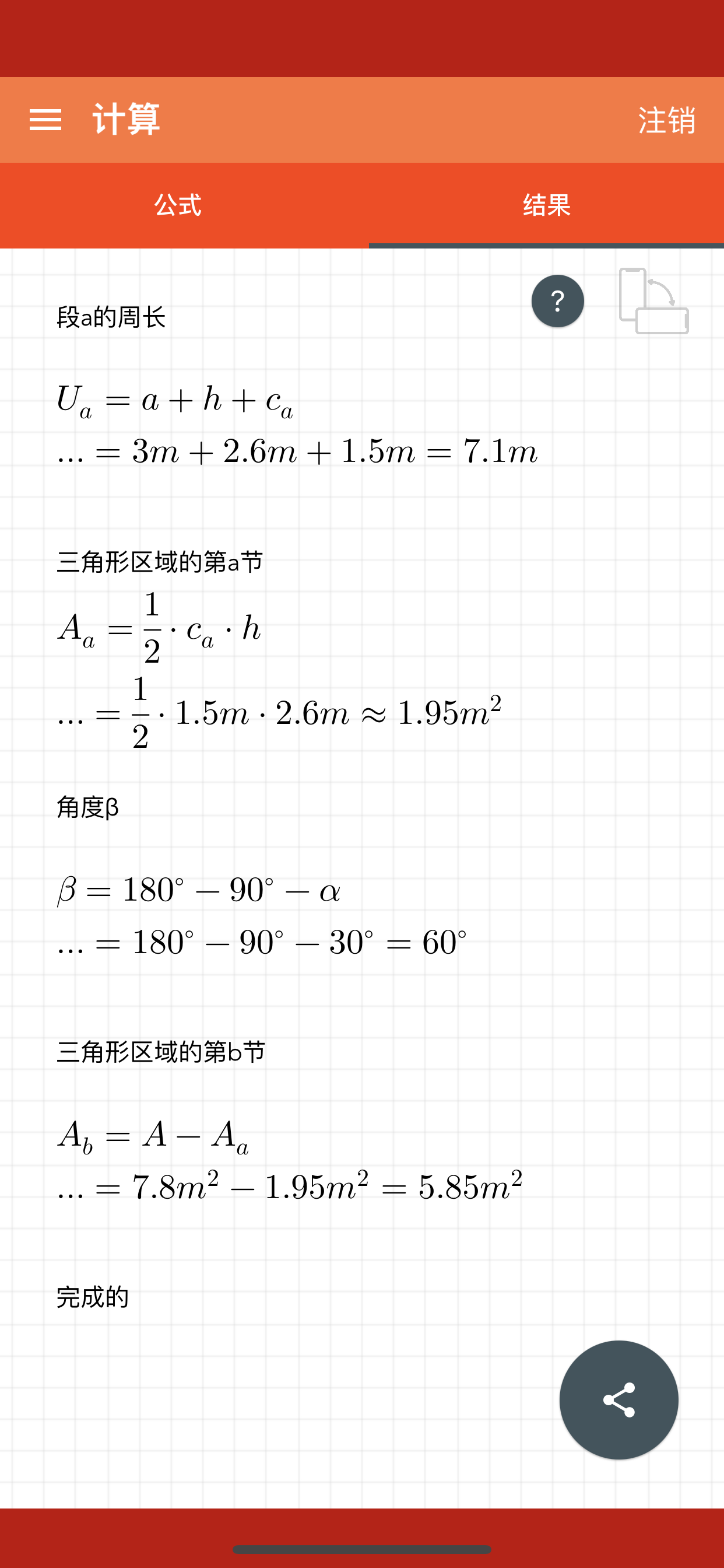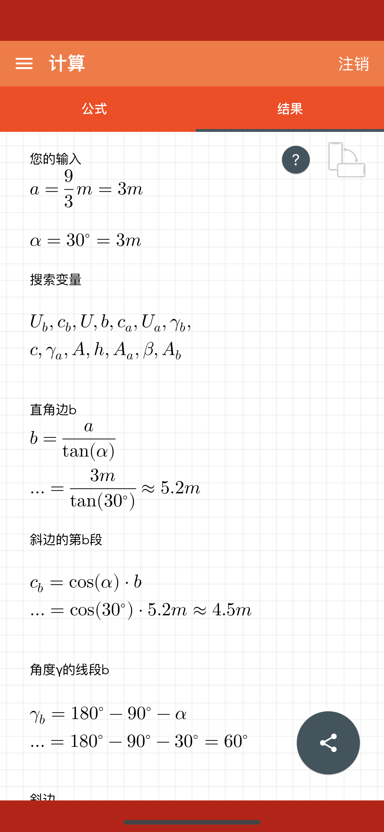 计算直角三角形的所有数量的最好的应用程序。你必须输入一些数量,如一个角度和一个长度。该算法搜索所缺数量的公式,显示它们并计算出结果。