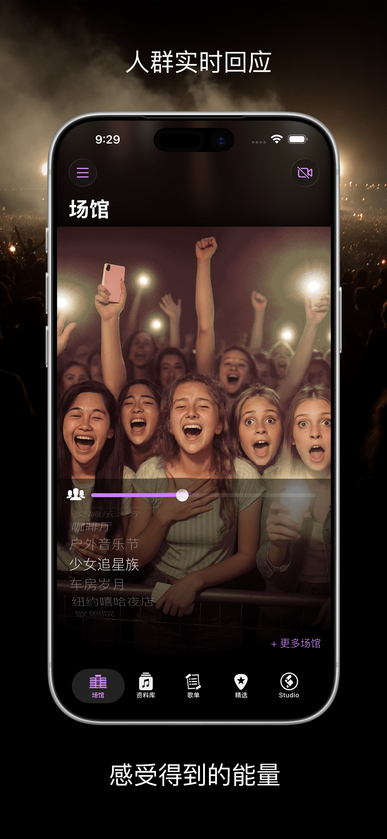 选一个场馆。建一个歌单。按下播放。就这么简单。