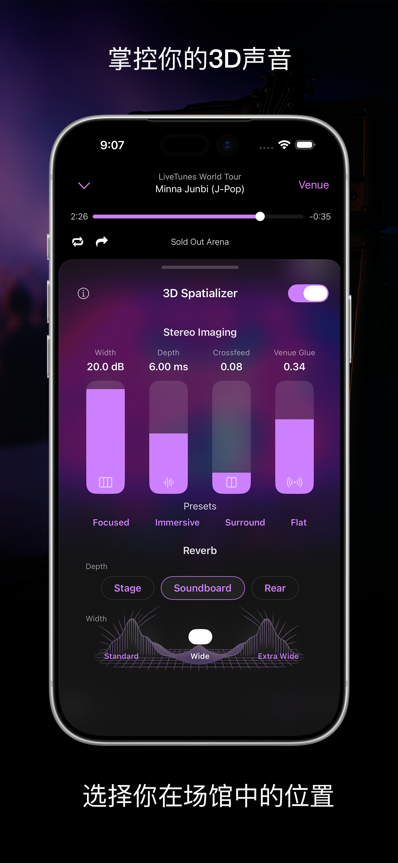 • 真实场馆音效 — 不是普通混响。真实卷积混响捕捉真实空间的声音,为每首歌增添自然的纵深感和独特个性。
