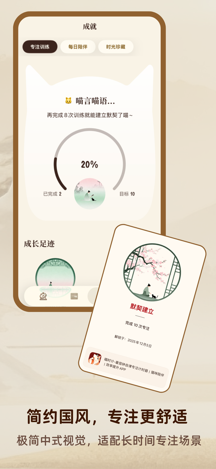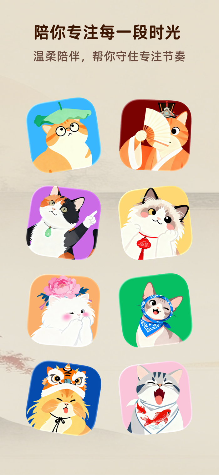 快来下载喵时计,给自己一方温暖治愈的专注小天地,在宁静禅意里,和小猫一起,成为更自律、更高效的自己。
