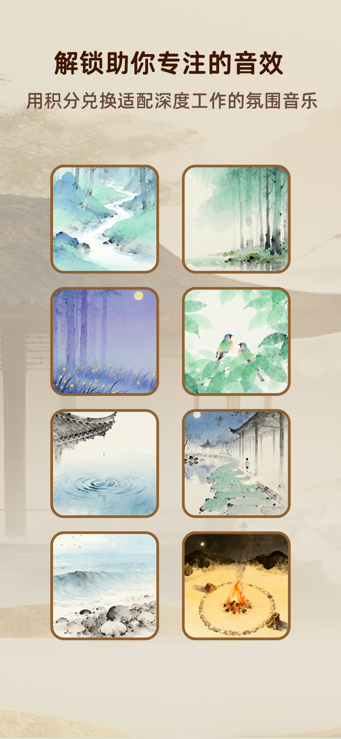 • 庭院窗景界面:告别冰冷机械的计时器。一屏国风庭院窗景,把每一次专注都变成静心修行,瞬间抚平焦虑,让自习与深度工作充满仪式感