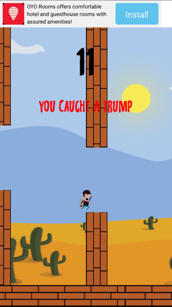 在这款高风险冒险游戏中,玩家要独自负责在唐纳德·特朗普逃出墨西哥沙漠并穿过他所建的墙回到美国之前将其追捕。玩法为点击屏幕飞行,不惜一切代价避开墙,尽可能飞得远并沿途捕获尽可能多的特朗普,每次击败“最佳”分数,不让特朗普翻过墙。