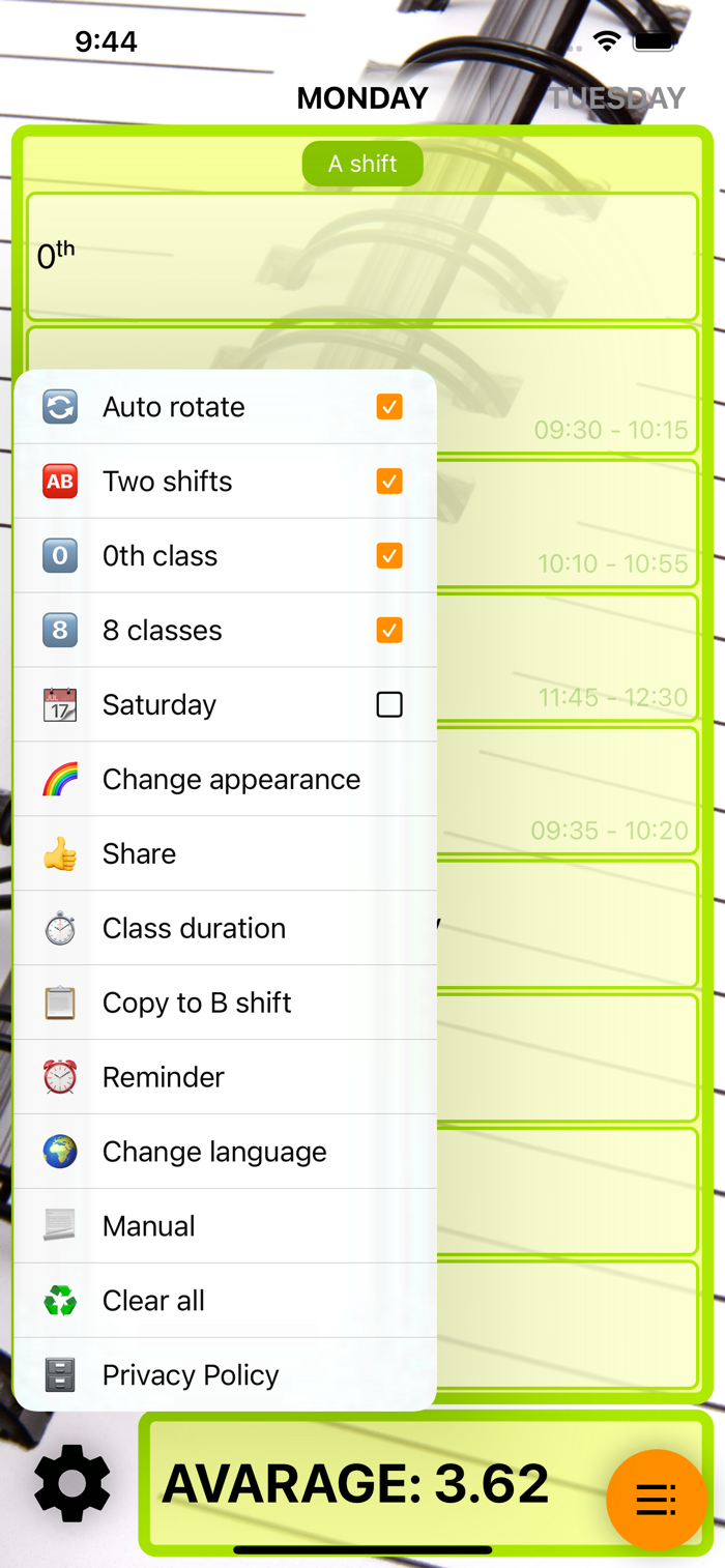 你可以选择添加第0节或第8节课,它支持双班制的课程表,保存上课开始和结束时间、教室名称、日历提醒……这款应用程序包含多种主题、样式、过渡效果、可自定义背景——这样你就可以让你的我的学校课程表独一无二。