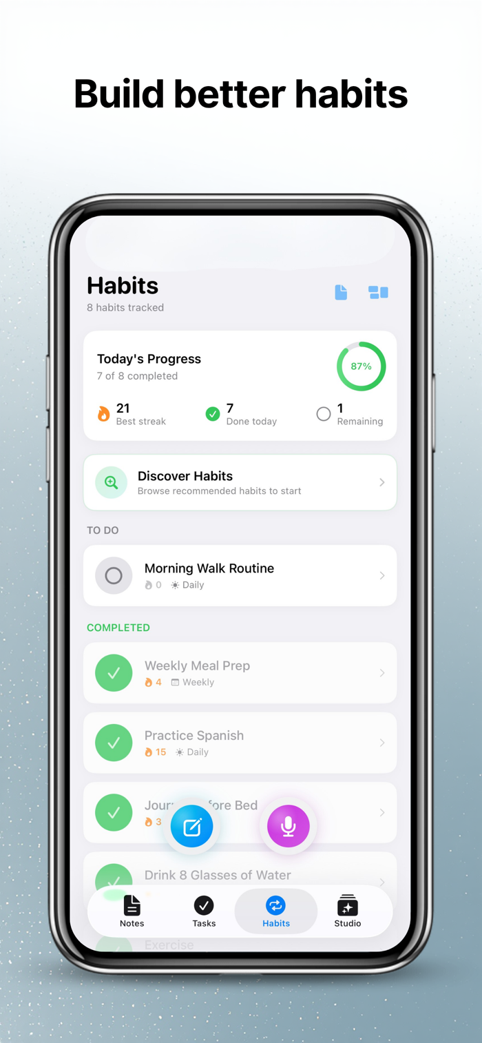 无论你是在路上突然想到一个点子,想快速记下一条语音笔记,安排今天的任务,还是希望更稳定地坚持自己的习惯,NoteOS 都能帮助你先记录、再整理、再行动。