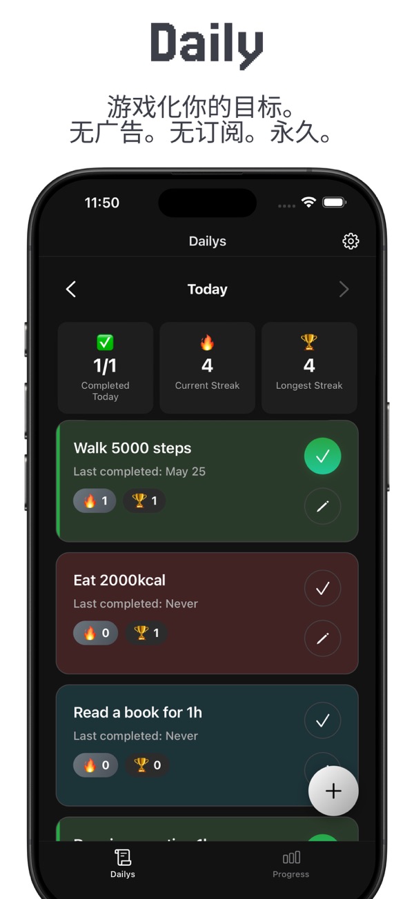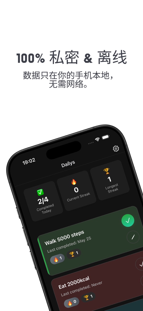 Daily让生活如每日升级。它能将每日目标变成有趣任务,可自定义每日任务,用独特名称和颜色定制目标,还能追踪连续记录保持动力。数据100%私密且离线使用,存储在iPhone上,无广告、无订阅,一次性购买永久拥有。其简洁设计的精美直观界面,助你专注于目标。Terms apply: https://www.apple.com/legal/internet-services/itunes/dev/stdeula/
