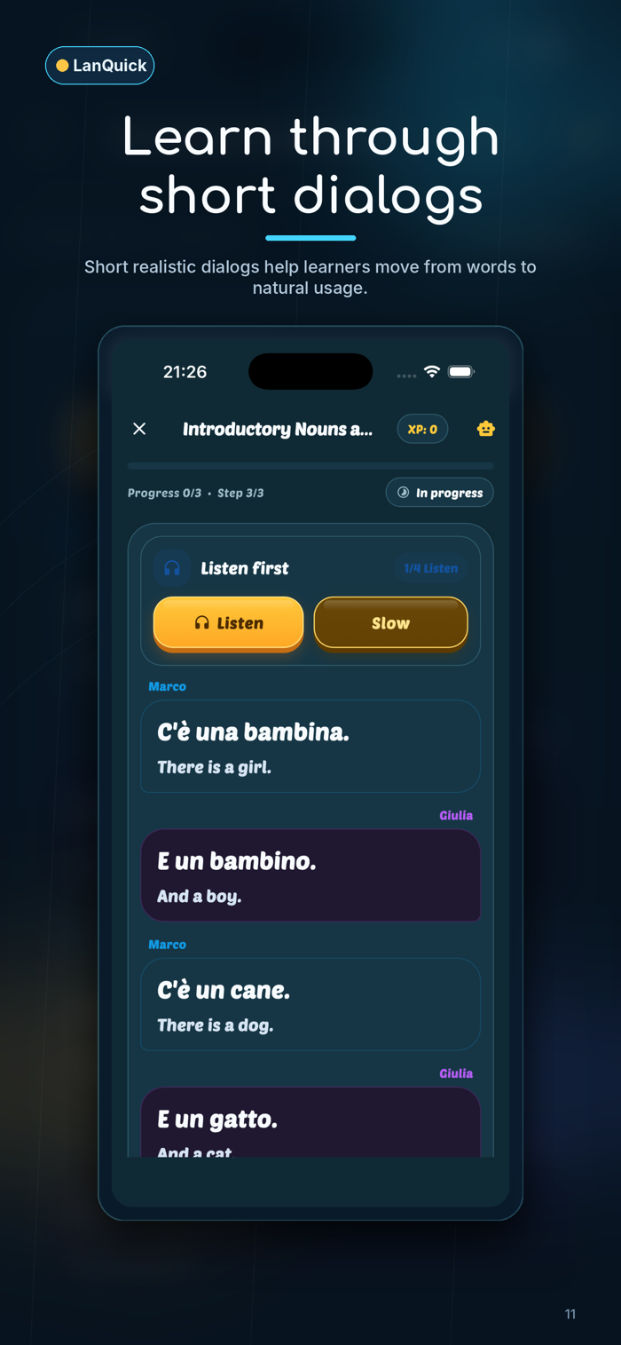 Terms of Use: https://www.lanquick.com.tr/terms-of-usecal dialogues, vocabulary building, listening activities, and speaking practice. Whether you are a complete beginner or looking to improve your skills, Lanquick gives you a simple and motivating way to make progress every day.