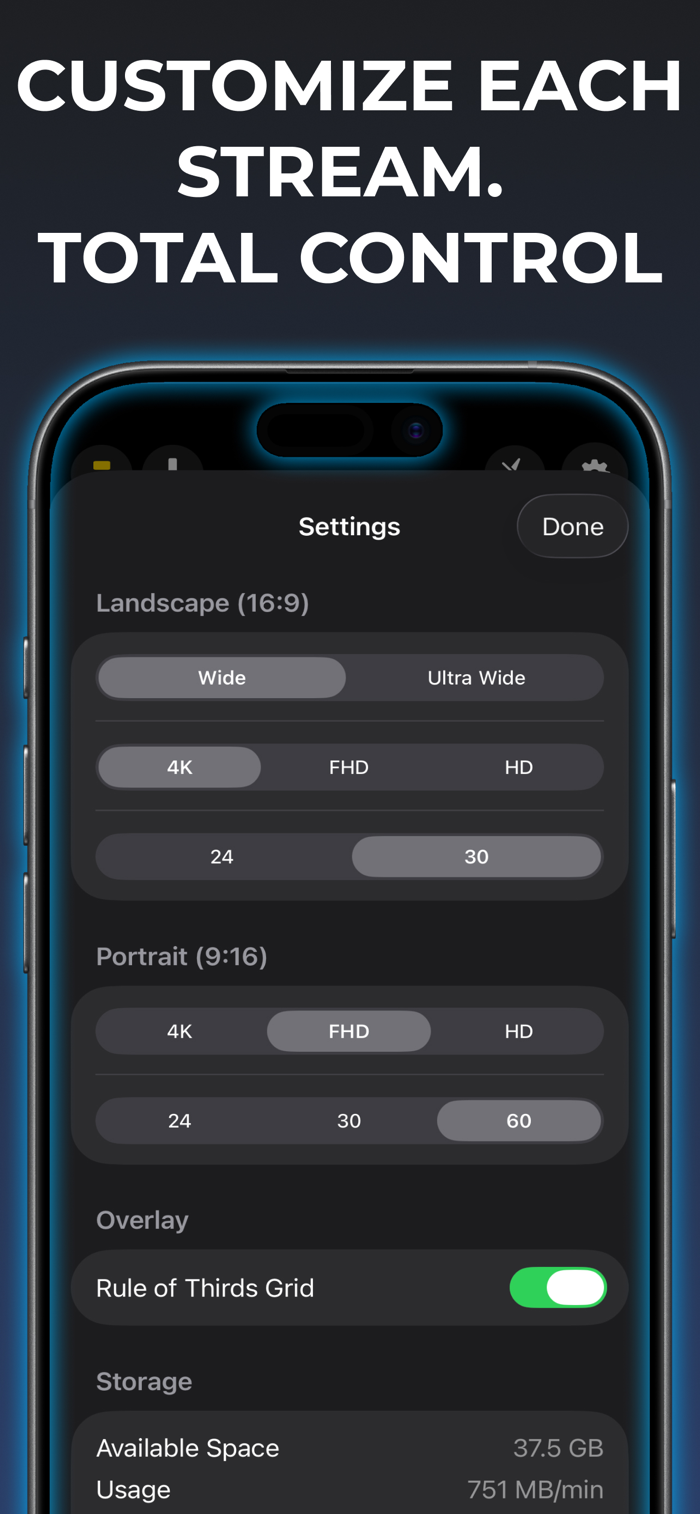 Hit record once. The app writes two separate video files: widescreen landscape and vertical portrait. Both save directly to your Photo Library. No post-processing, no cropping, no quality loss.